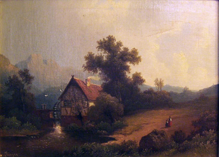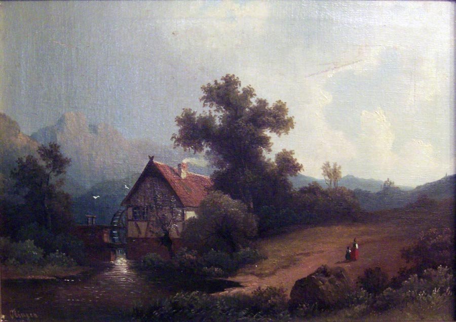 Wassermühle im Vorgebirge mit Personen; romantische Landschaft. 2.H. 19. Jh.