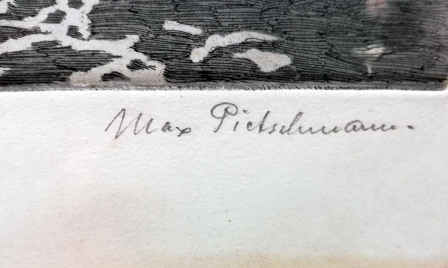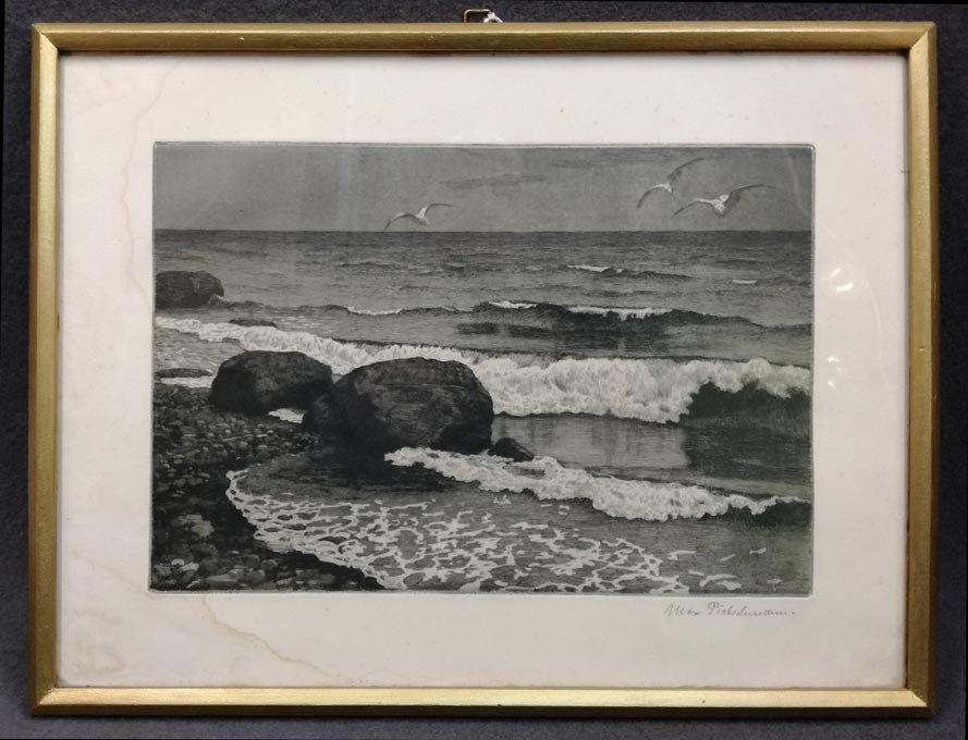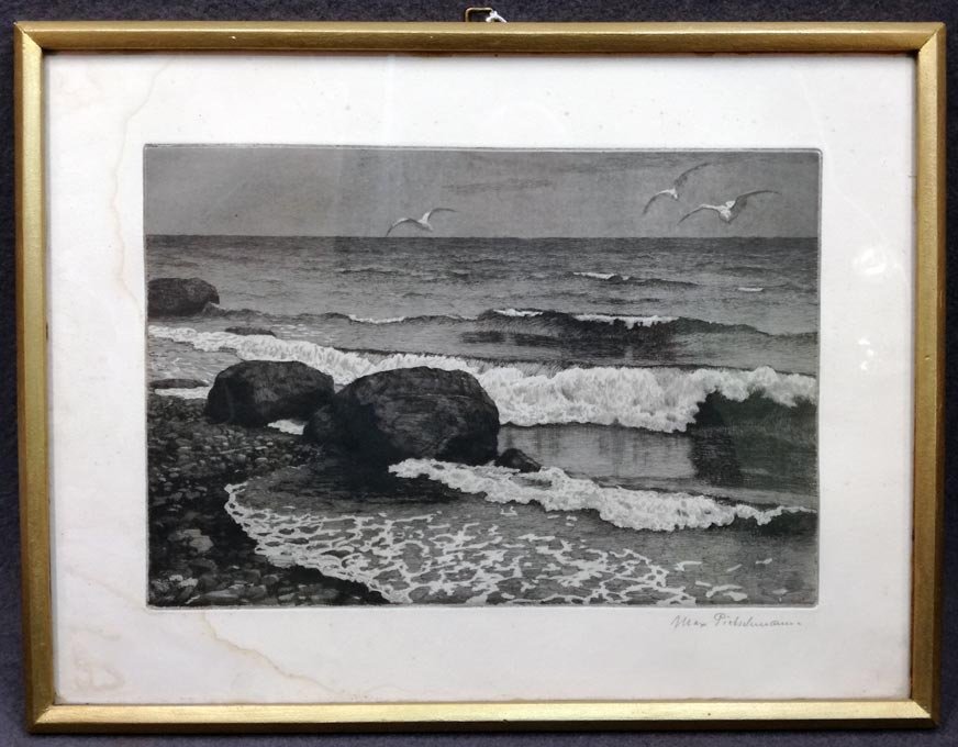 Pietschmann, Max; Meeresbrandung Radierung um 1916. Re. unterhalb der Darstellung in Blei signiert: "Max Pietschmann" Links ausserhalb der Darstellung Feuchtigkeitsränder. In altem Rahmen. Darst.: 31,5 x 22 cm; Blatt: 41,5 x 32 cm