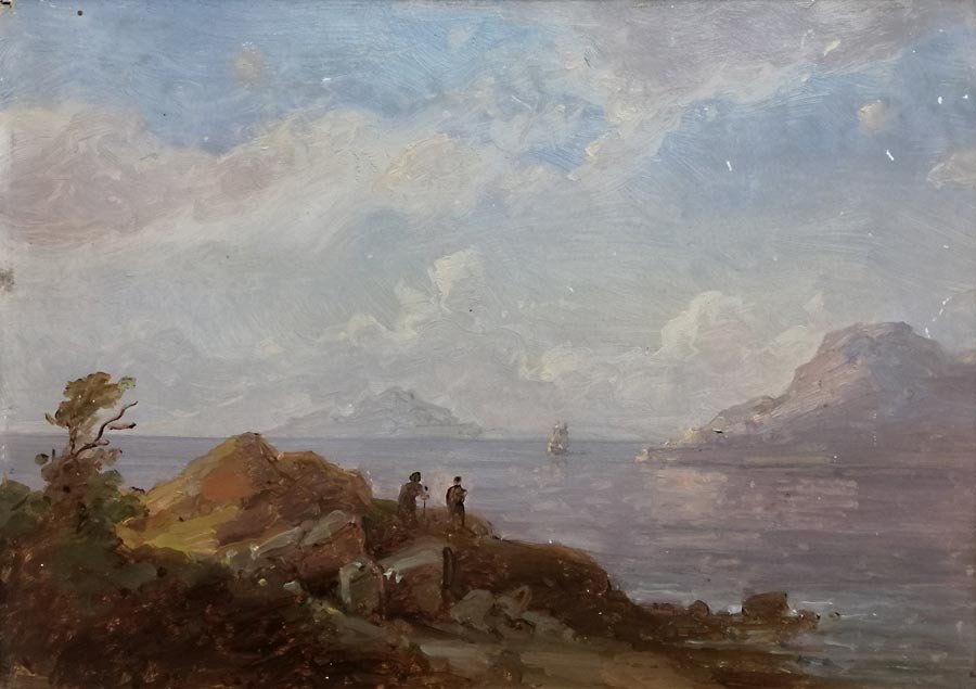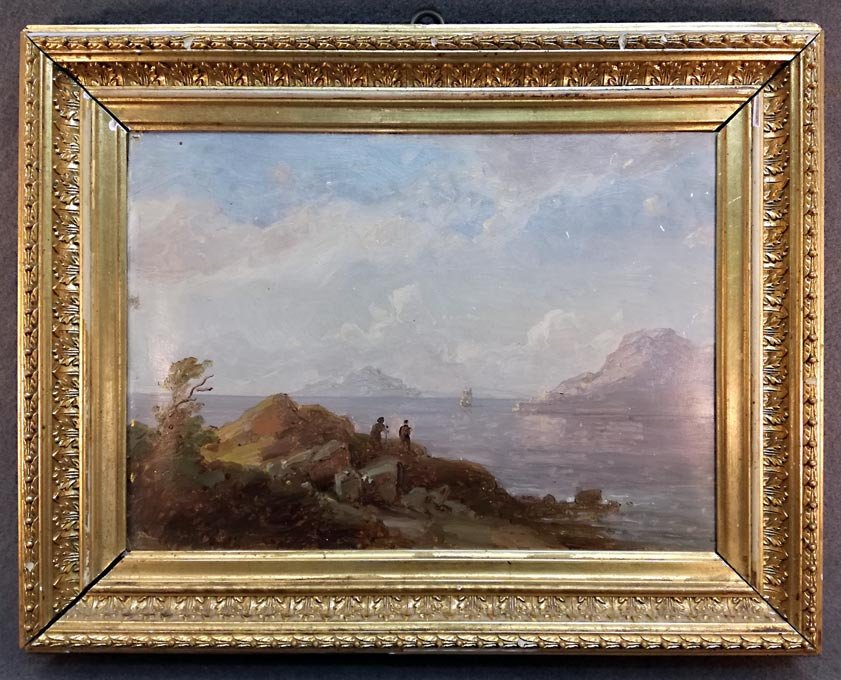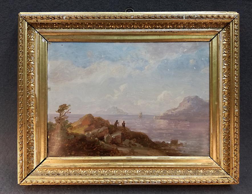 Südliche Küstenlandschaft, Ölstudie auf Papier auf Pappe im Originalrahmen a.d. Zeit.