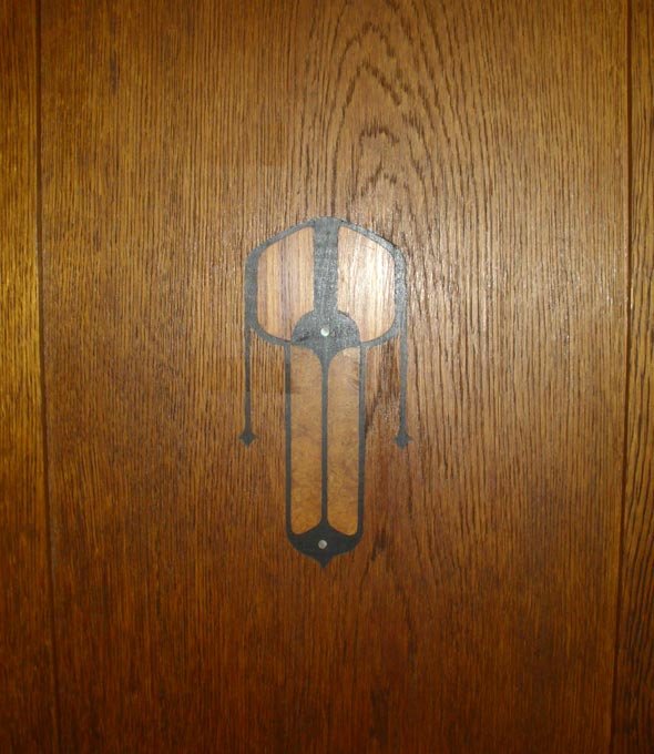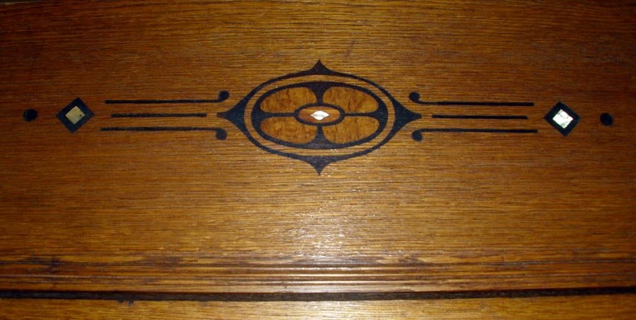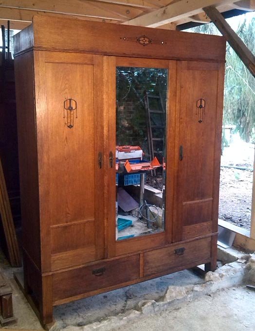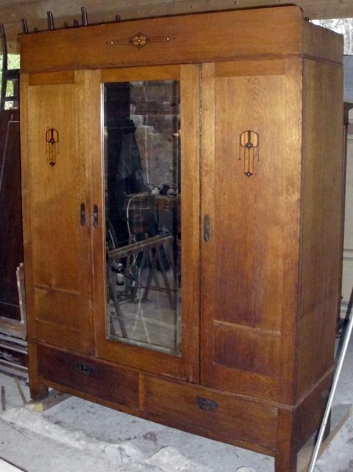 Großer Kleiderschrank, dreitürig, Jugendstil um 1910. Helle Eiche mit Intarsien, großer facettierter Spiegel. Spiegel i.O. Sehr guter, wohnfertiger Zustand.