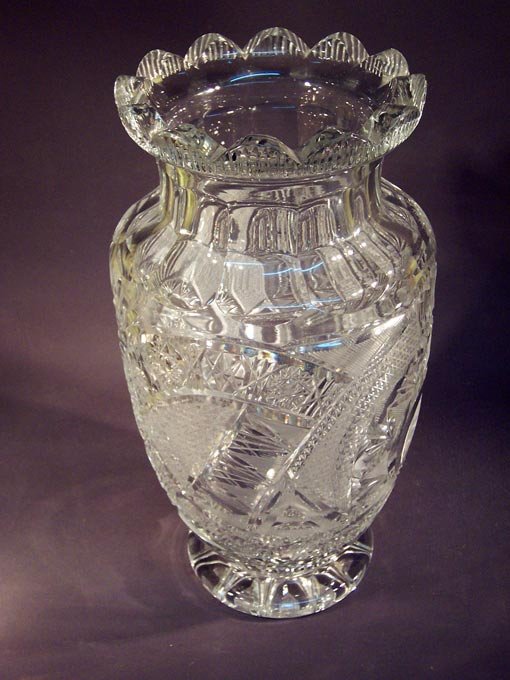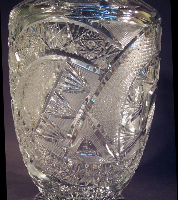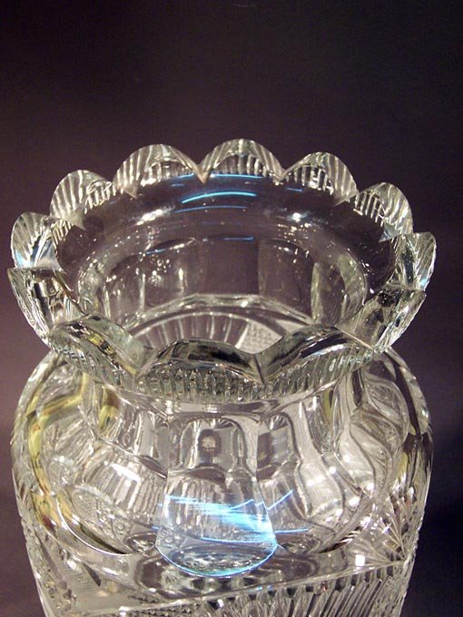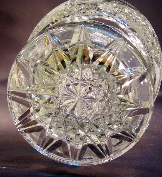 Reich und aufwändig geschliffen. Hals und Übergang zum Fuß facettiert. Bodenschliff.