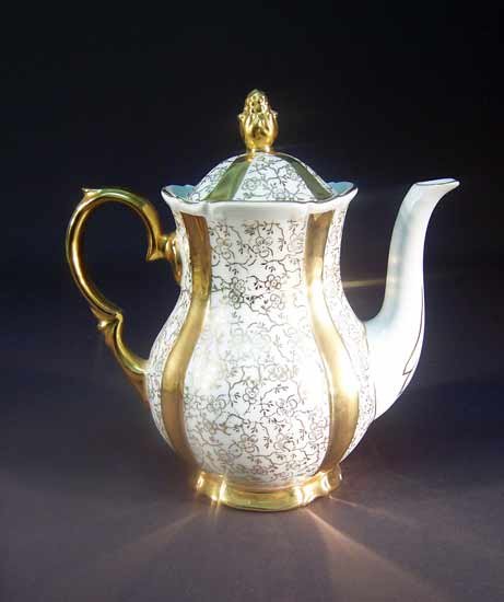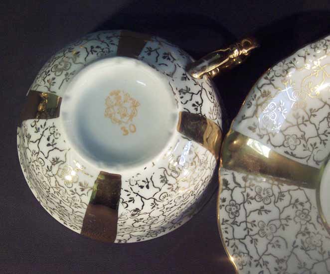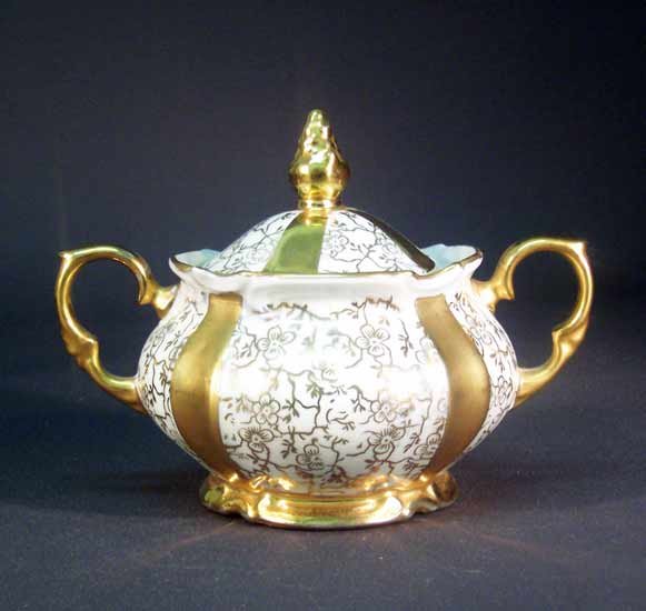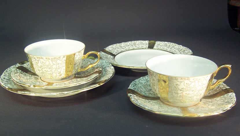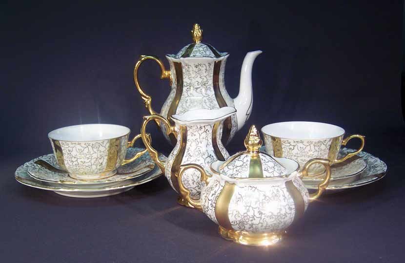 Unger & Schilde, Roschütz Reich verziertes Service. Auf den weißen Feldern filigrane Goldmalerei.