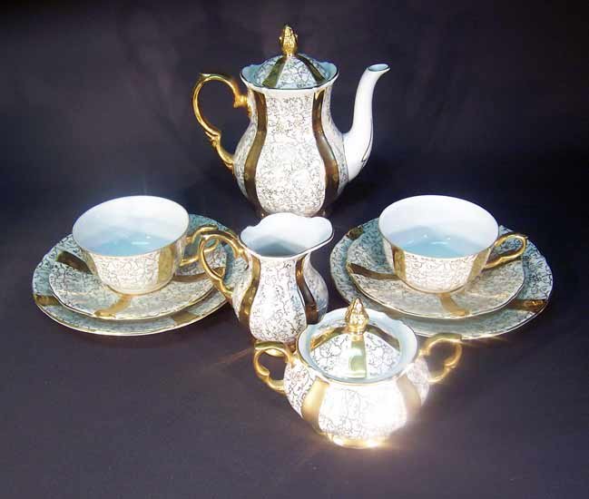 Original für 2 Personen, Zuckerdose, Sahne- und Kaffeekanne in entsprechend kleiner Ausführung. 9 Teile für 2 Personen bestehend aus: Kernstück; Kaffeekanne, Sahnekännchen, Zuckerdose und 2 Gedecken mit je Tasse, Unterteller und Kuchenteller. Sehr guter Zustand ohne Beschädigungen, geringer Goldabrieb.