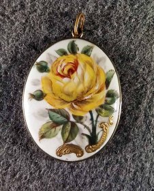 Anhänger, Porzellan, handgemalt, Gelbe Rose in Fassung. Ungemarkt, 4,6 cm x 3,7 cm.