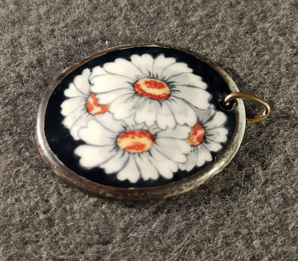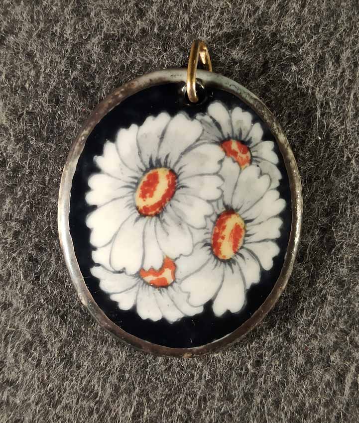 Porzellananhänger mit Blumenmalerei, gemarkt: Bavaria handgemalt. Etwas Farbabrieb am Rand. 4,8 cm x 4 cm.