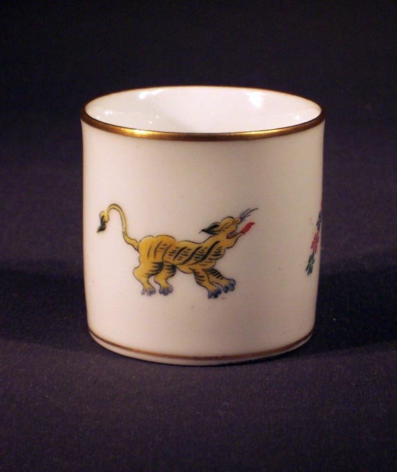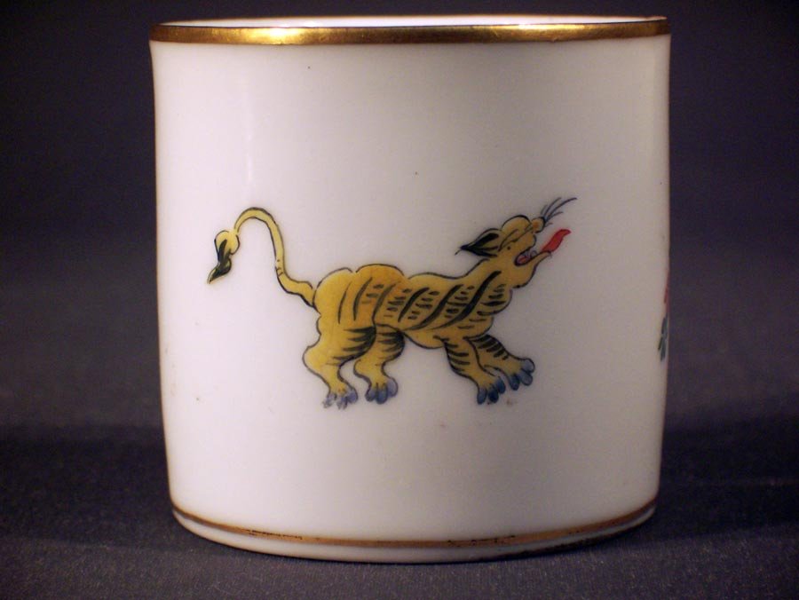 Kleiner Becher; asiatische Malerei mit Fabeltier. Möglicherweise ein Schnapsbecher oder Sakebecher?