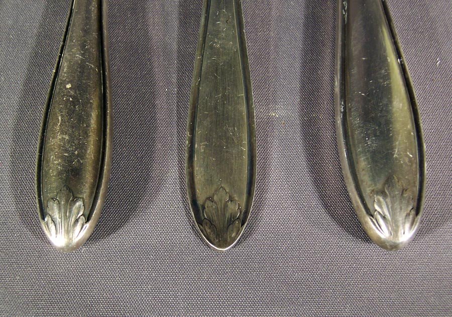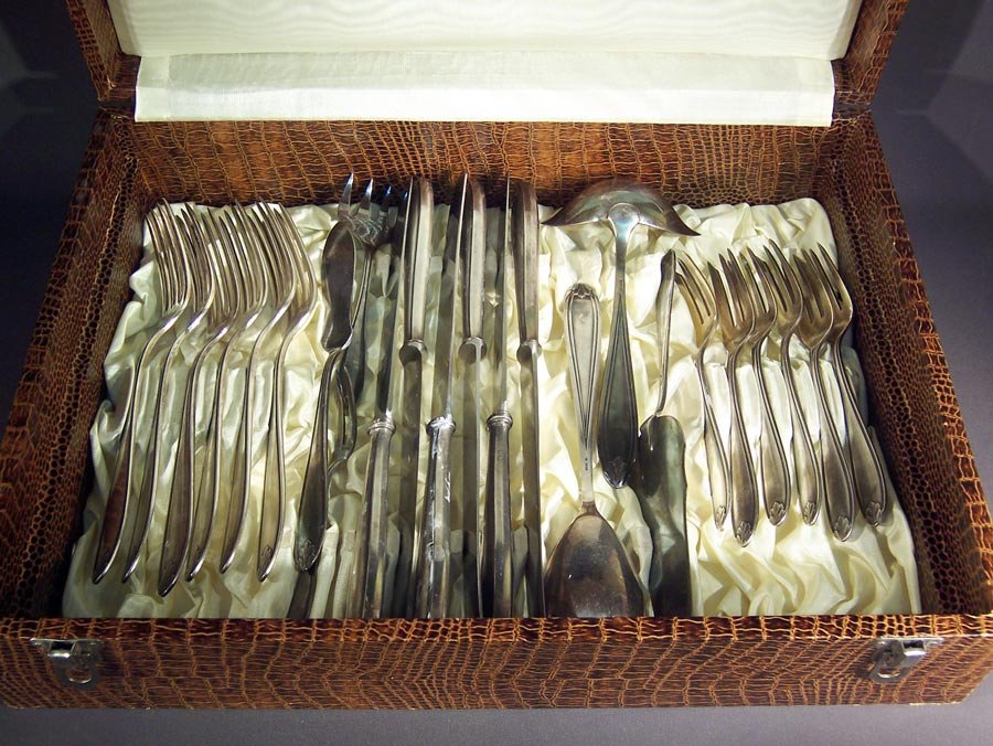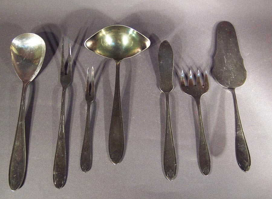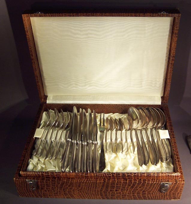 Besteck für 6 Personen, 49 teile. WMF, versilbert, im Kasten. Schlichte, elegante Form; Stielende beidseitig verziert mit Arkanthusblatt.
