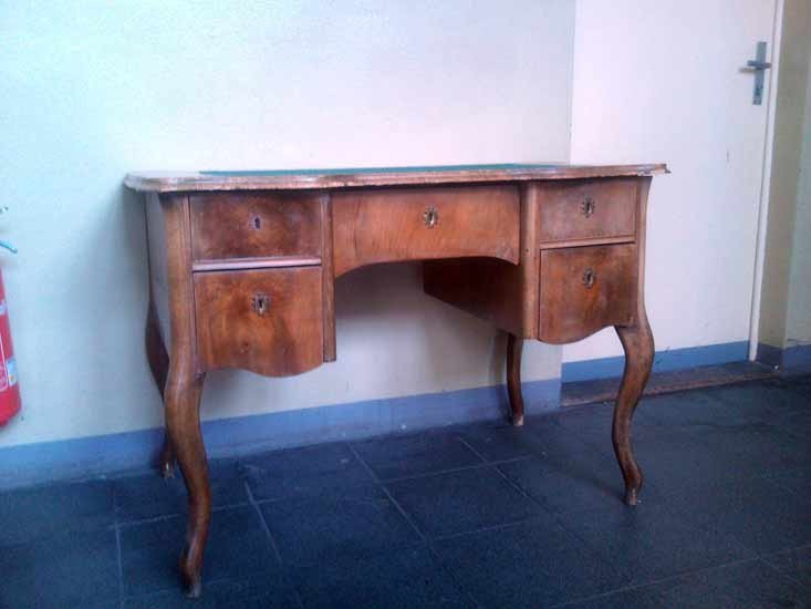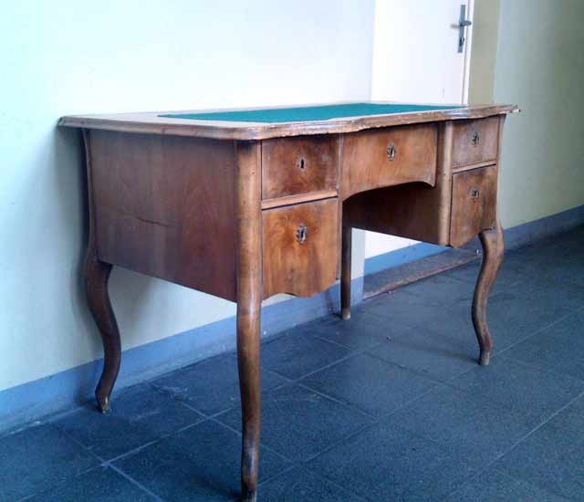 Schreibtisch im Barockstil, Österreich um 1860. Nußbaum auf Weichholz furniert und Nußbaum massiv. 5 Schubkästen.