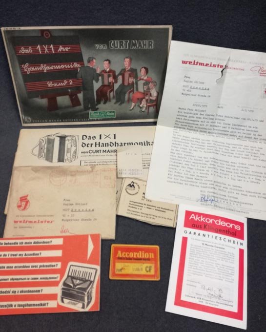 Dazu original Garantiurkunde, Pflegehinweise und ein persönliches Schreiben der Firma Weltmeister an den Besitzer/Käufer des Instrumentes sowie 2 Notenhefte.