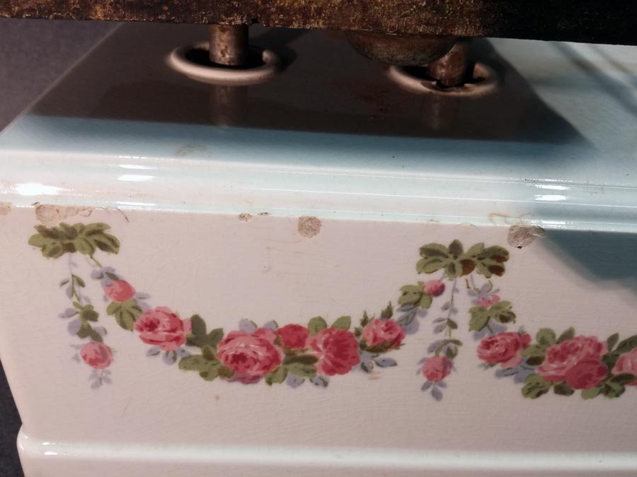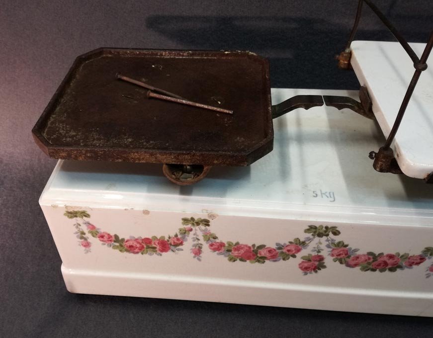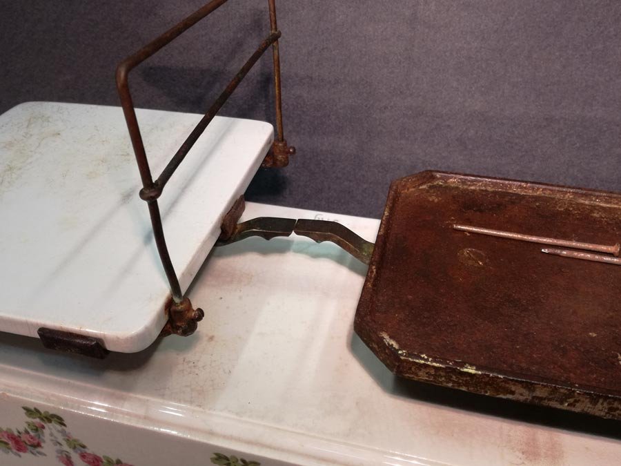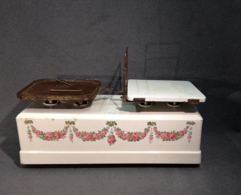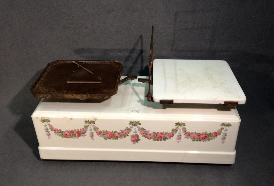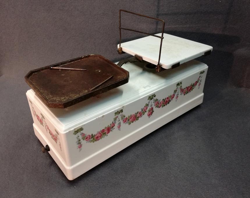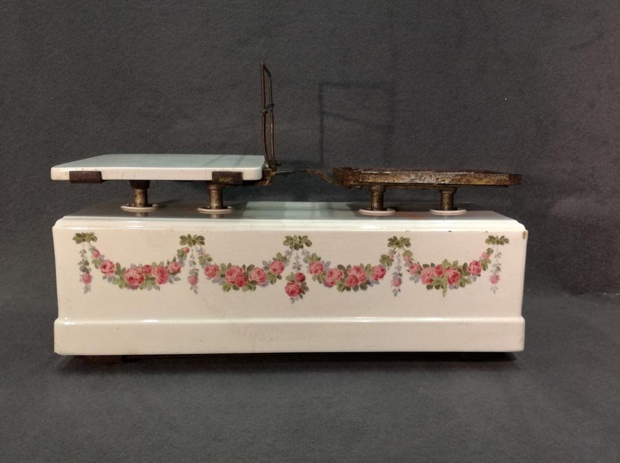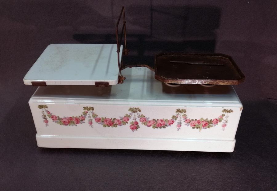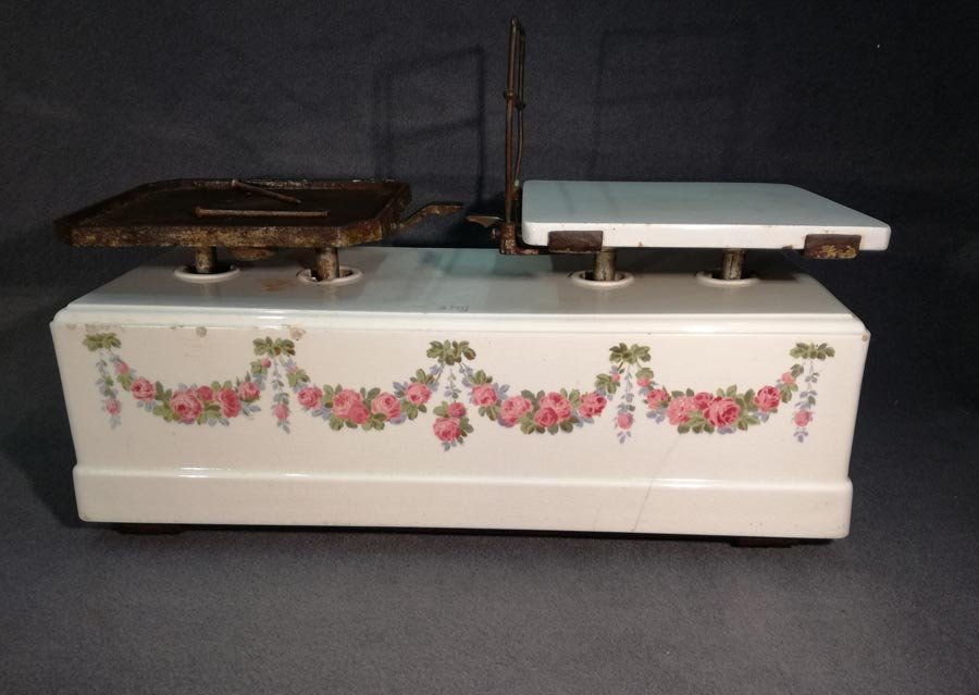 Alte Küchenwaage, Röschendekor ähnlich Max Rössler. Gut erhalten und funktionstüchtig. Mit Gebrauchsspuren, kleine Chips u.ä. aber i.O.