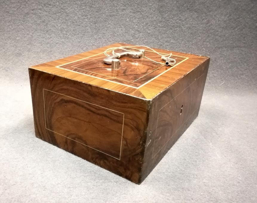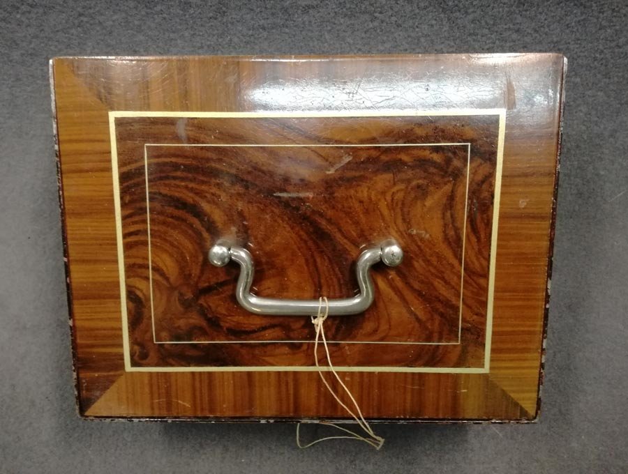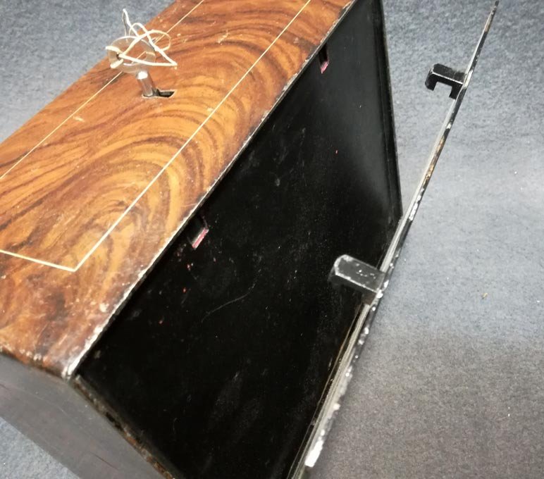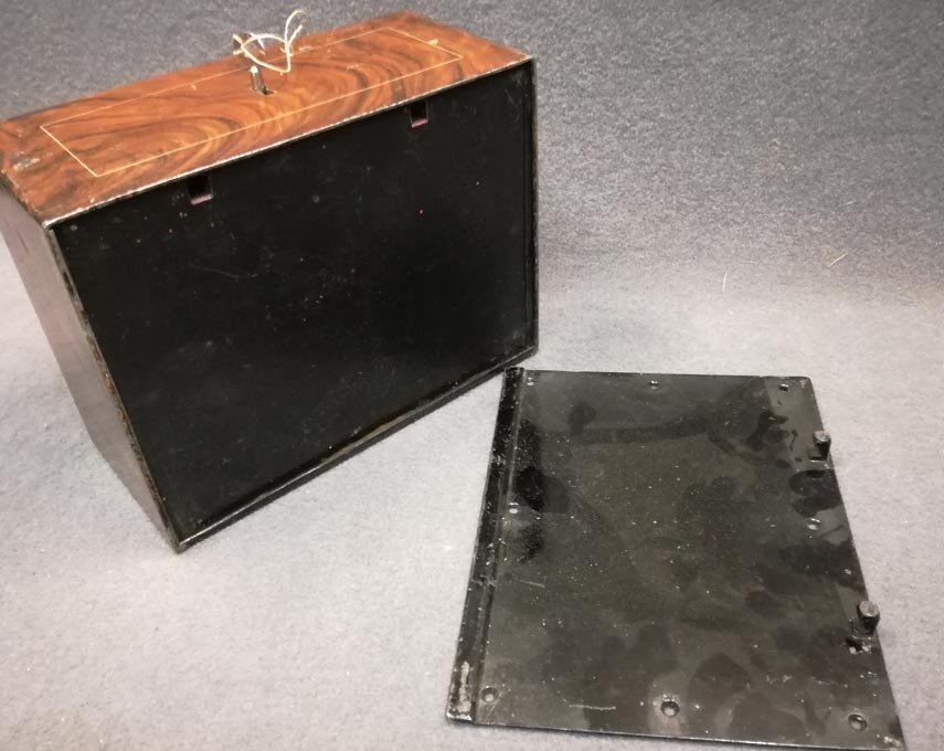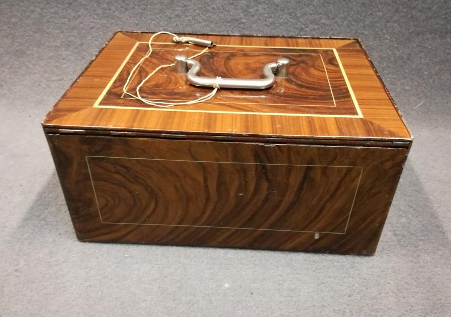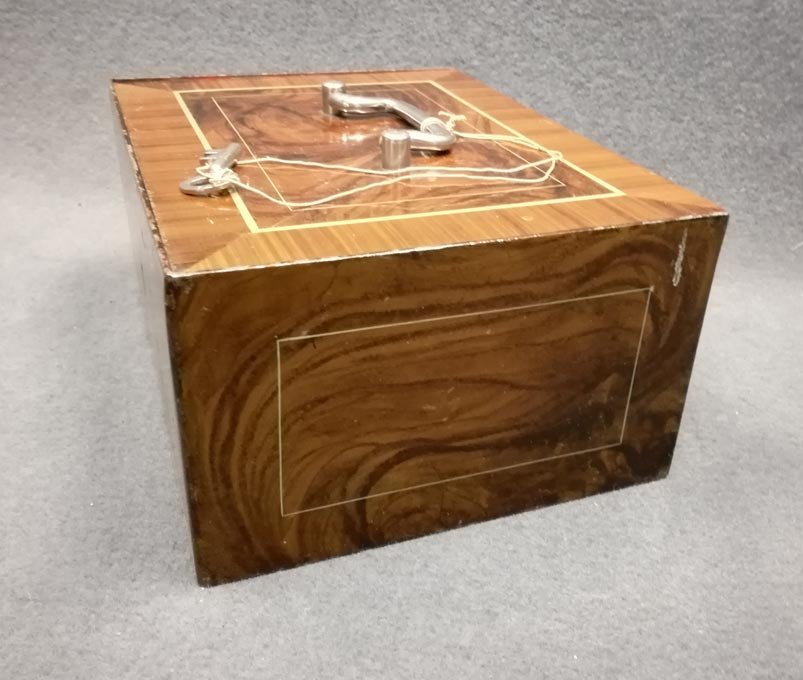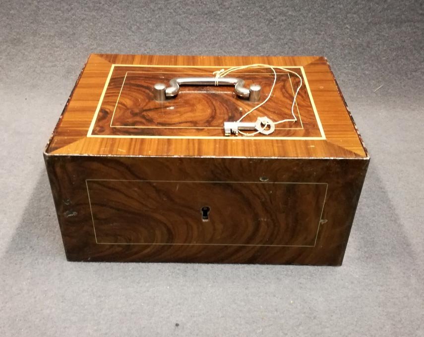 Geldkasette, um 1900. Eisen/Stahl mit aufgemalter Holzmaserung.