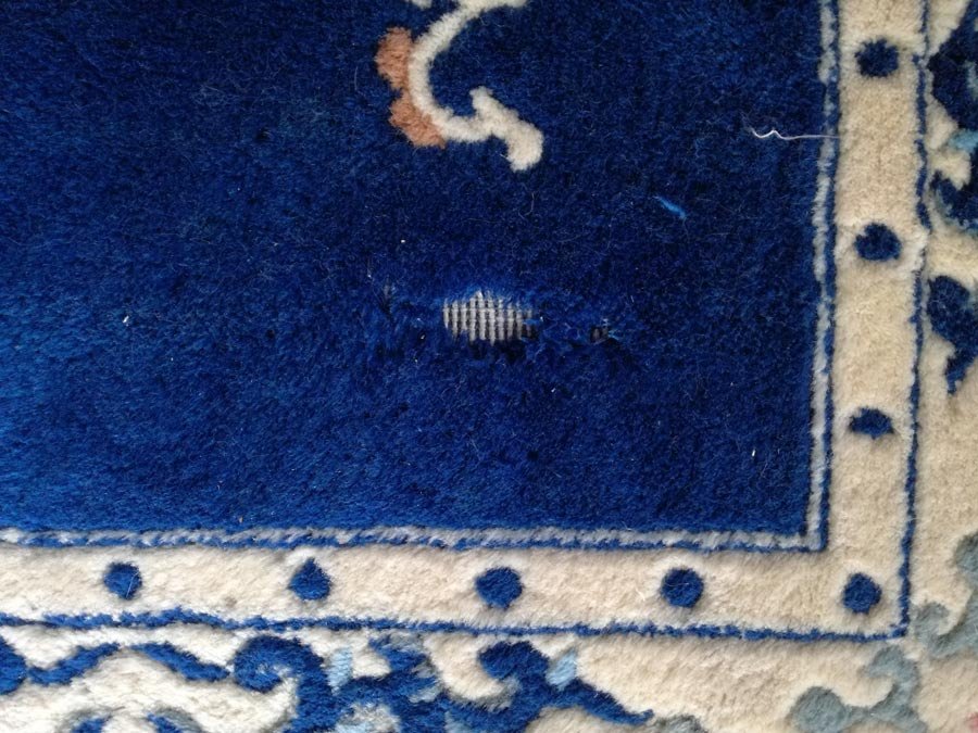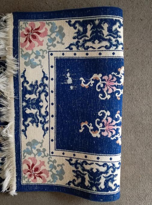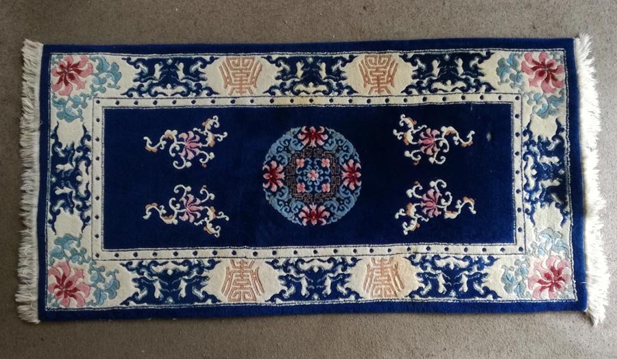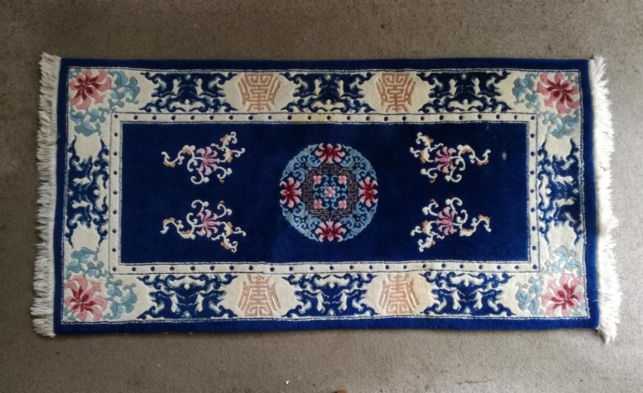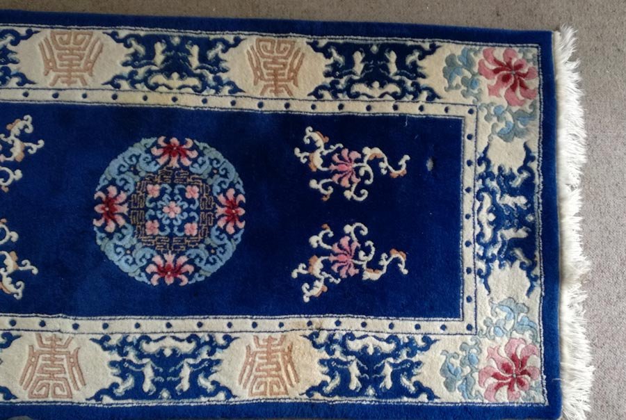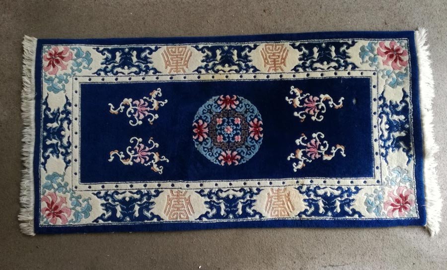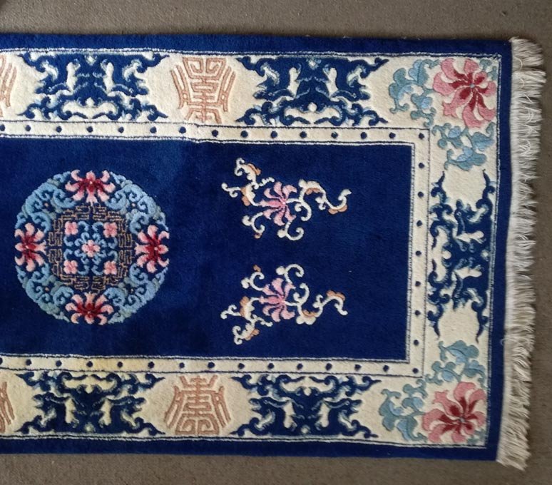 Teppich, 100% Wolle, Schurwolle, handgeknüpft. Hergestellt im letztes Drittel des vorigen Jahrhunderts verm. in Vietnam. Guter Zustand. Eine Wollfehlstelle ca 3cm, siehe Foto. L. 180/200 cm, B. ca 92 cm.