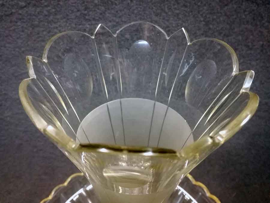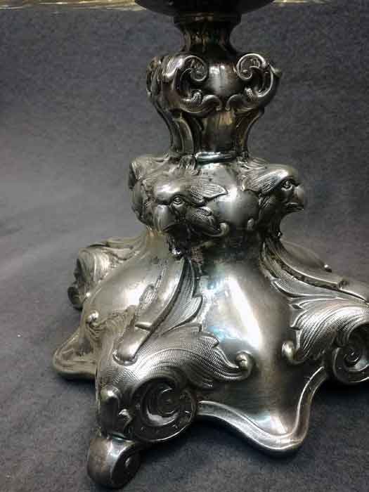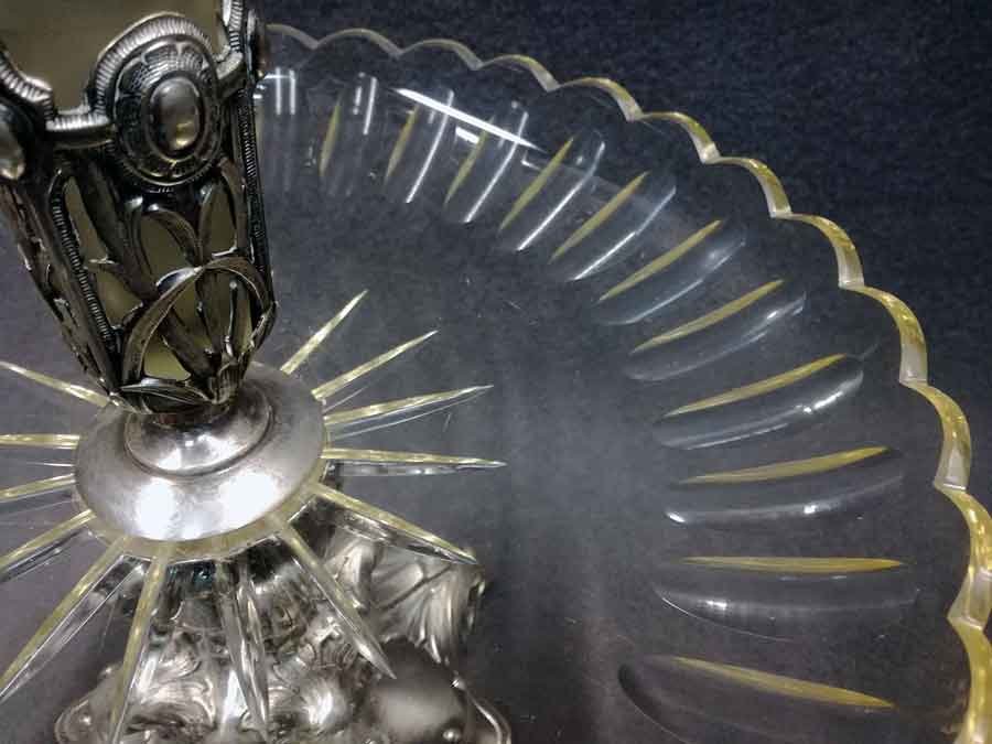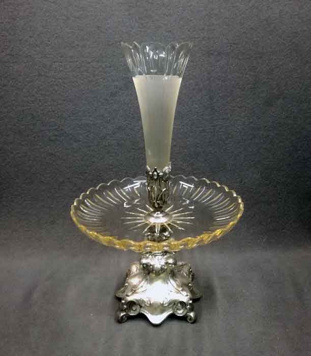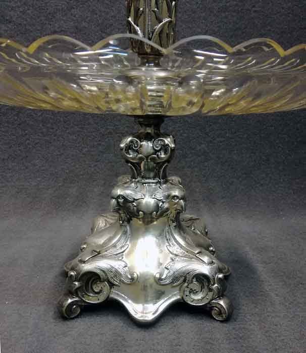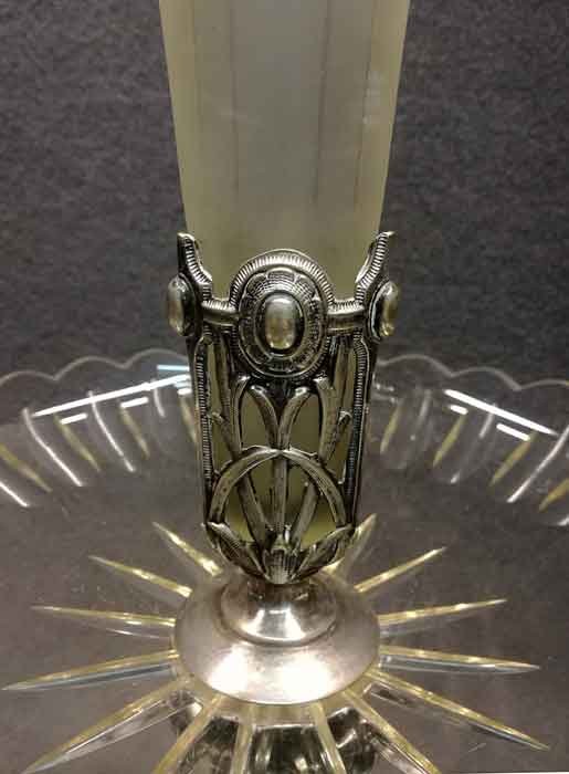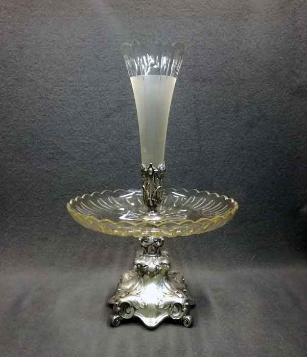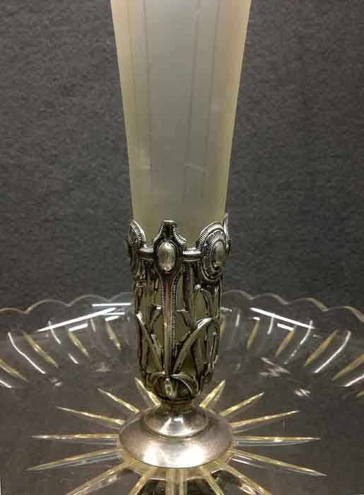 Tafelaufsatz, Jardiniere, Henninger Berlin. Fuß Versilbert?, Neusilber? mit Kristallschale bzw. Vase. H. ca 46 cm, D. ca 30 cm.