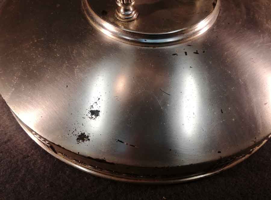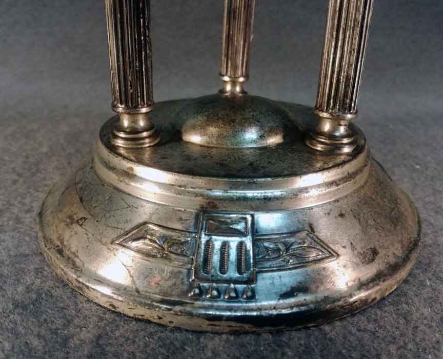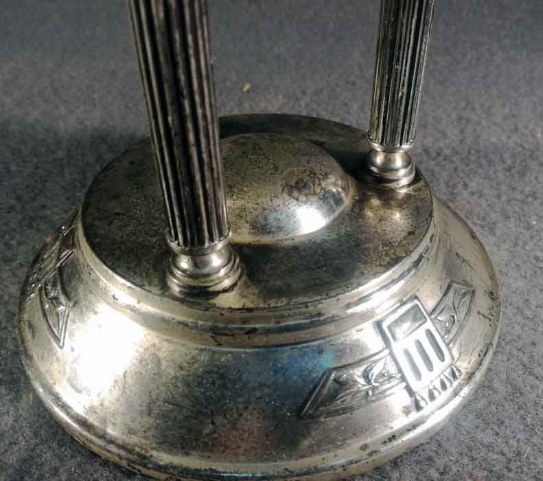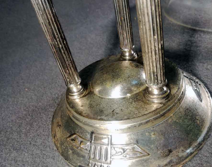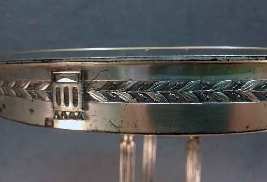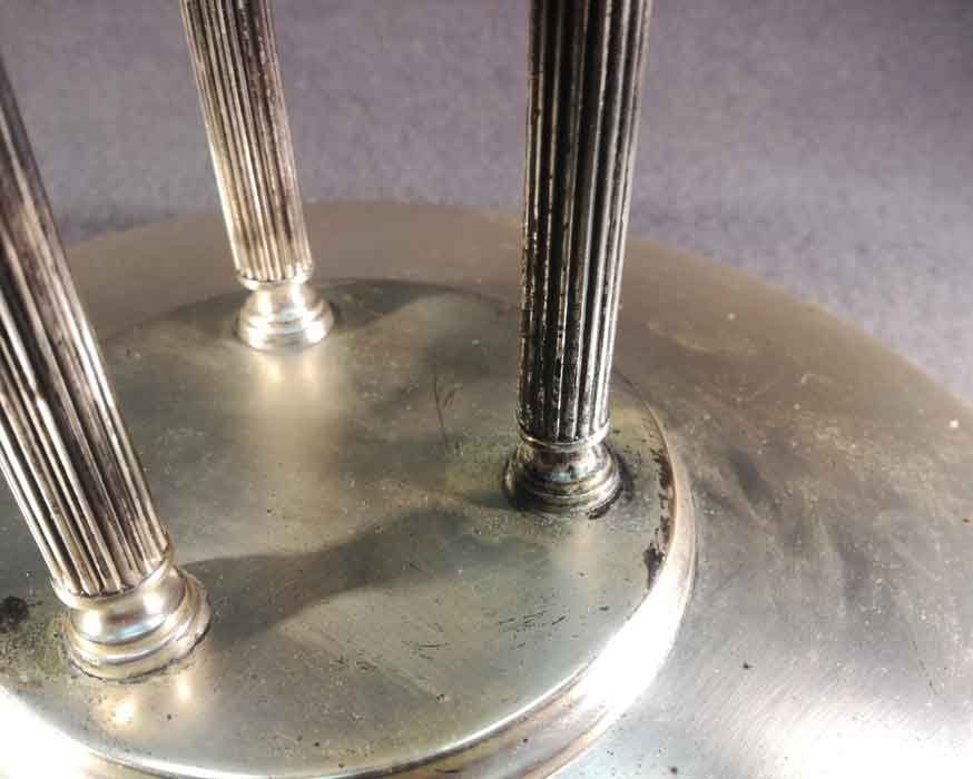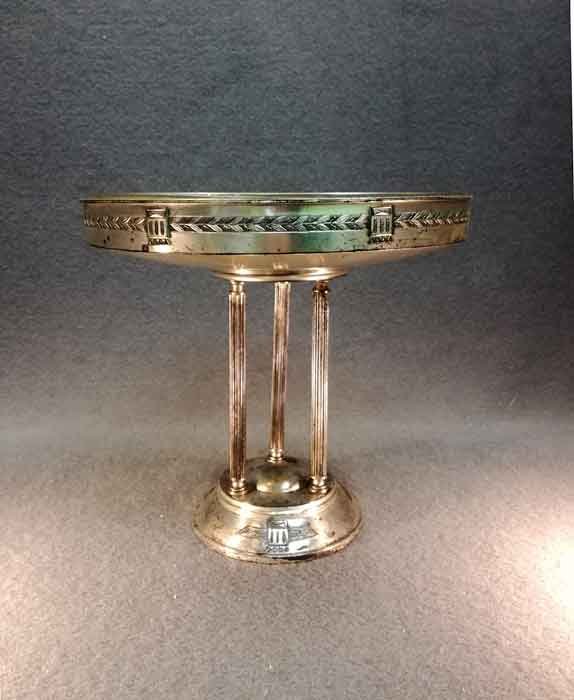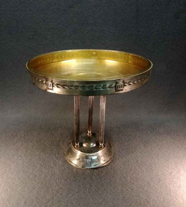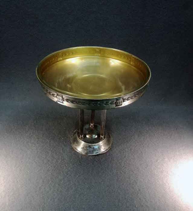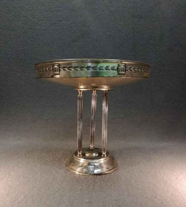 Tafelaufsatz, Jardiniere um 1900. Versilberter, dreisäuliger Aufsatz mit mit eingesetzter Glasschale. Oberfläche stellenweise mit Oxidationspuren, Gebrauchsspuren. Glaseinsatz i.O.