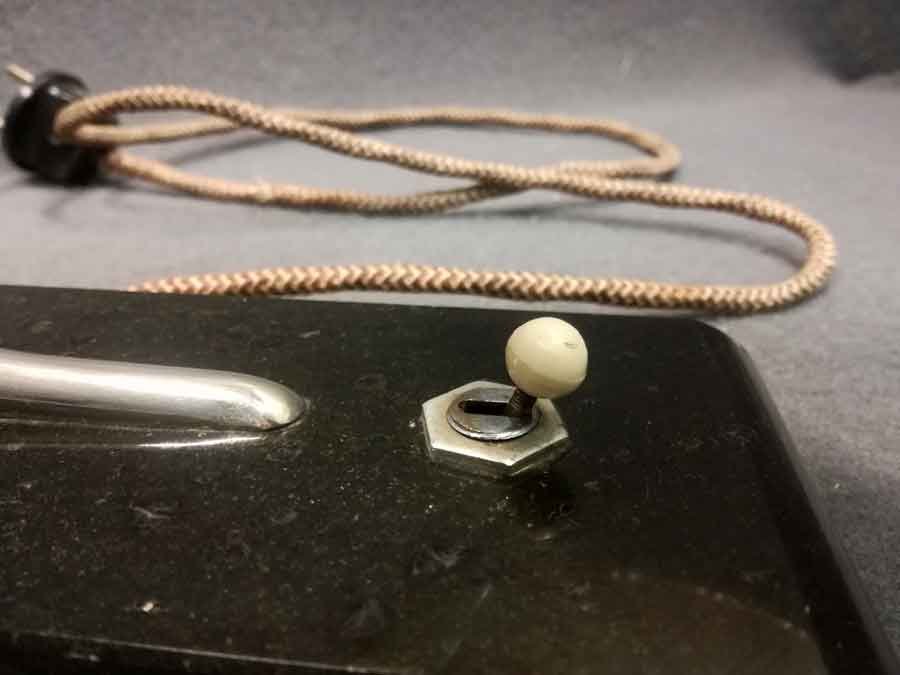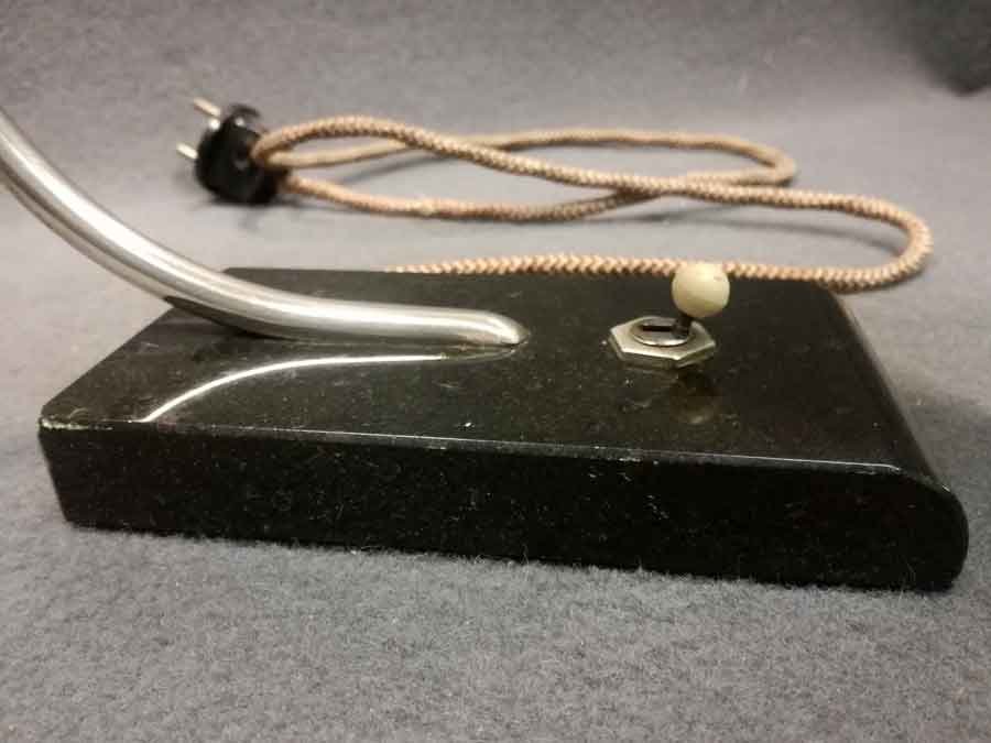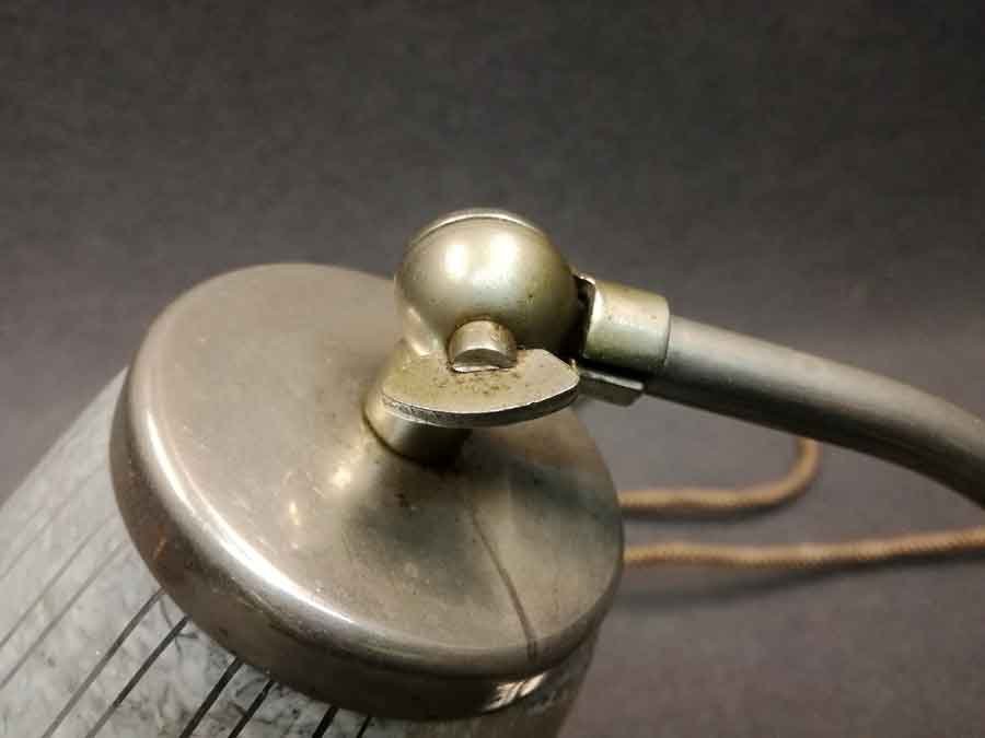 Kleine Tisch-, Nachttischlampe 1930er-50er Jahre. Marmorfuß, Glasschirm verstellbar. Elektrik nicht geprüft. Fuß L. x B. 14,5 x 8 cm, H. 22 cm.