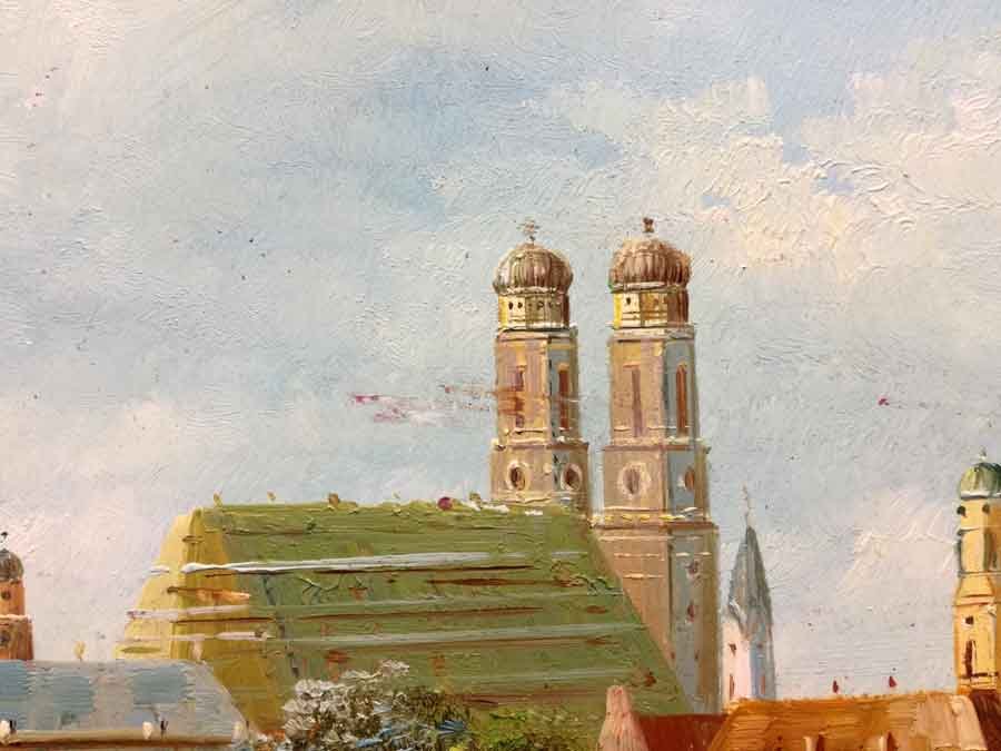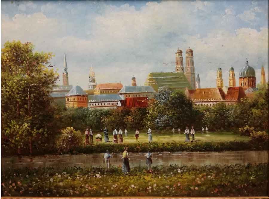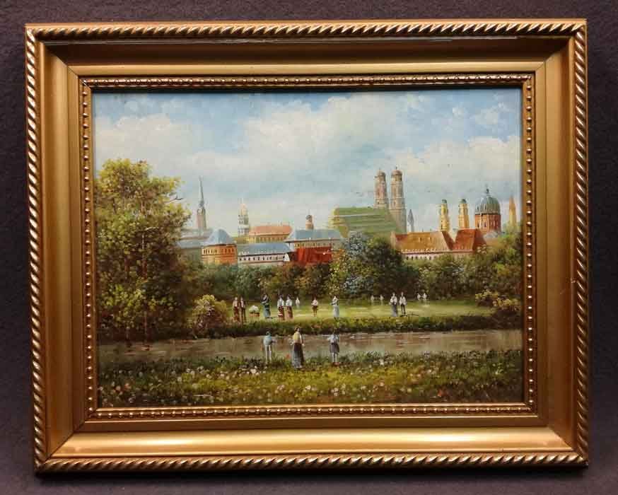Dekoratives Bild von München im Goldrahmen. Stadtansicht mit Natur, Fluss und Personenstafage.