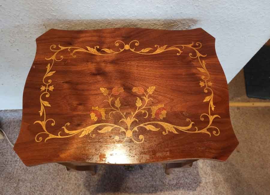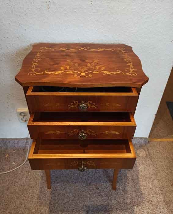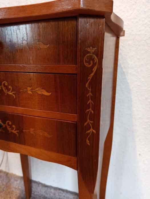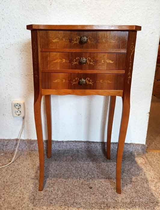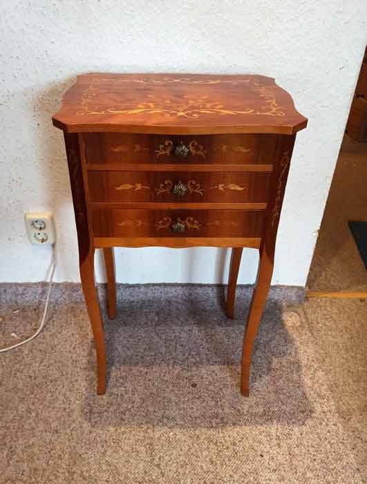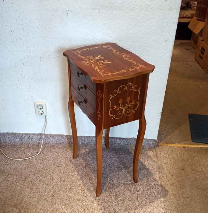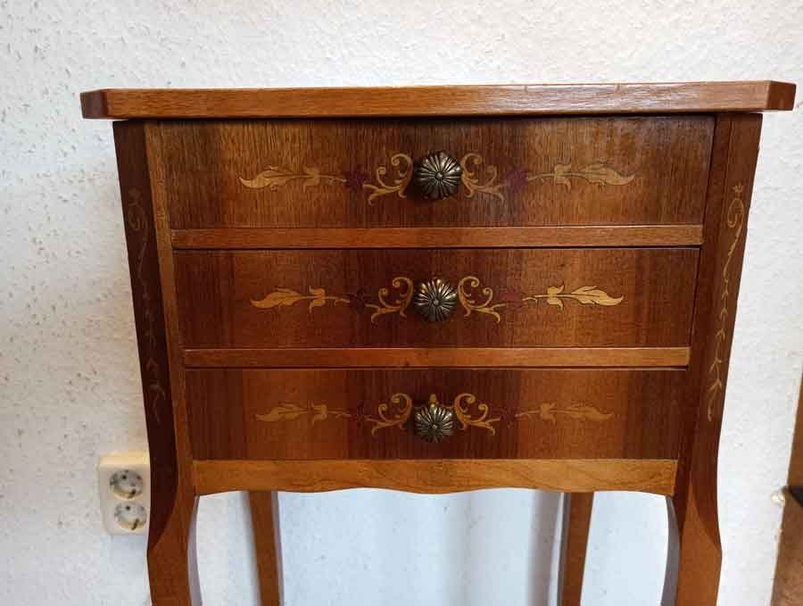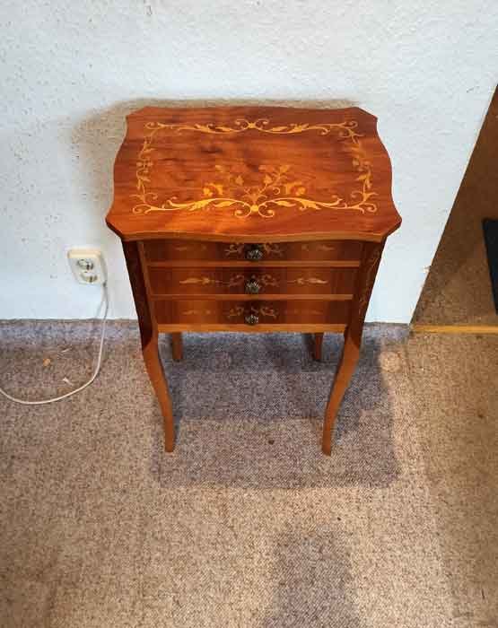 Kleiner Tisch mit drei Schubkästen. Allseitig mit schönen Blumenintarsien. Neuzeitliches Stilmöbel. Sehr guter Zustand. H, 74 cm, B. 43 cm, T. 31 cm