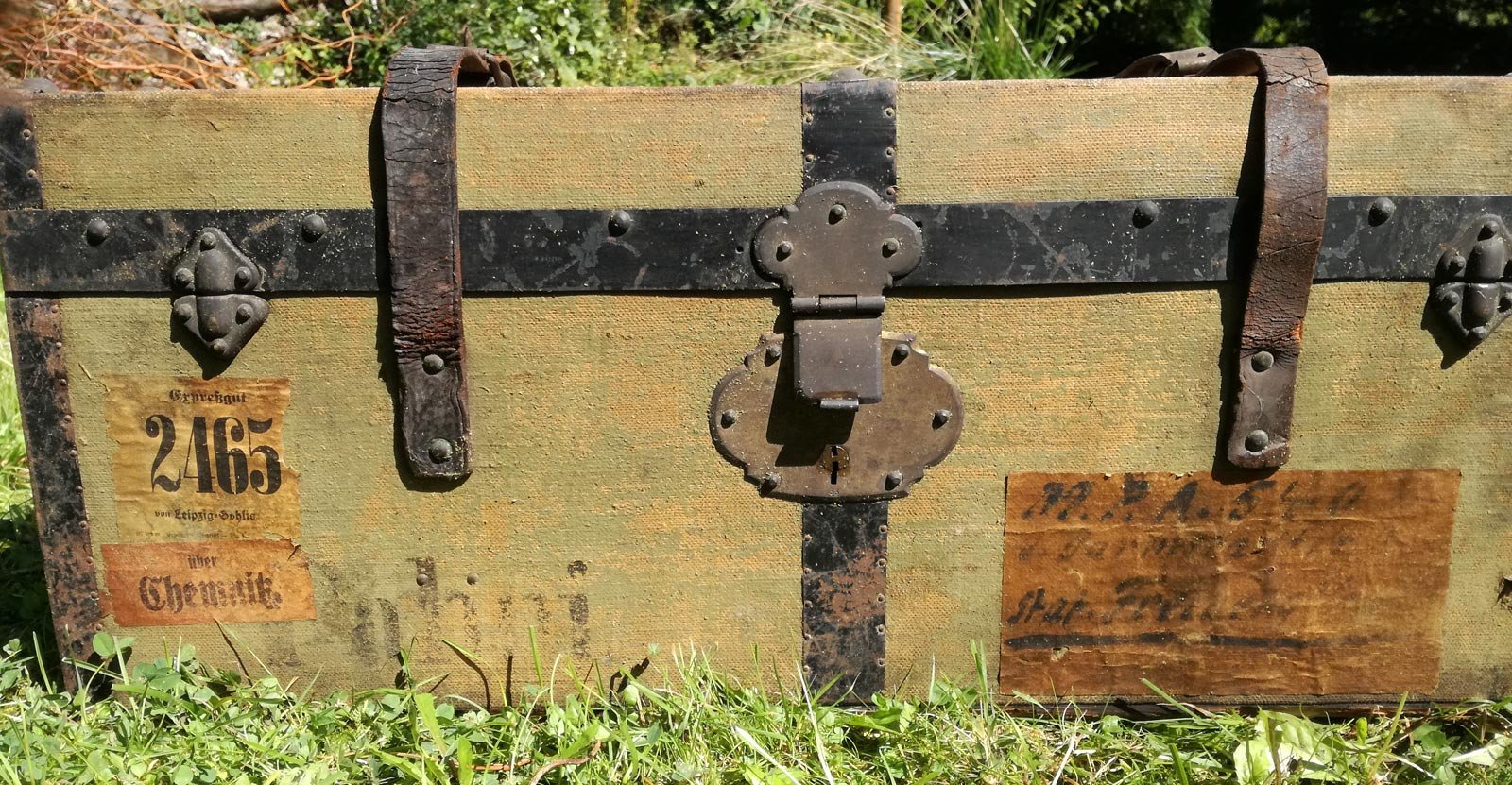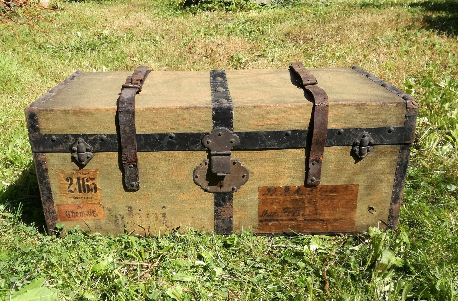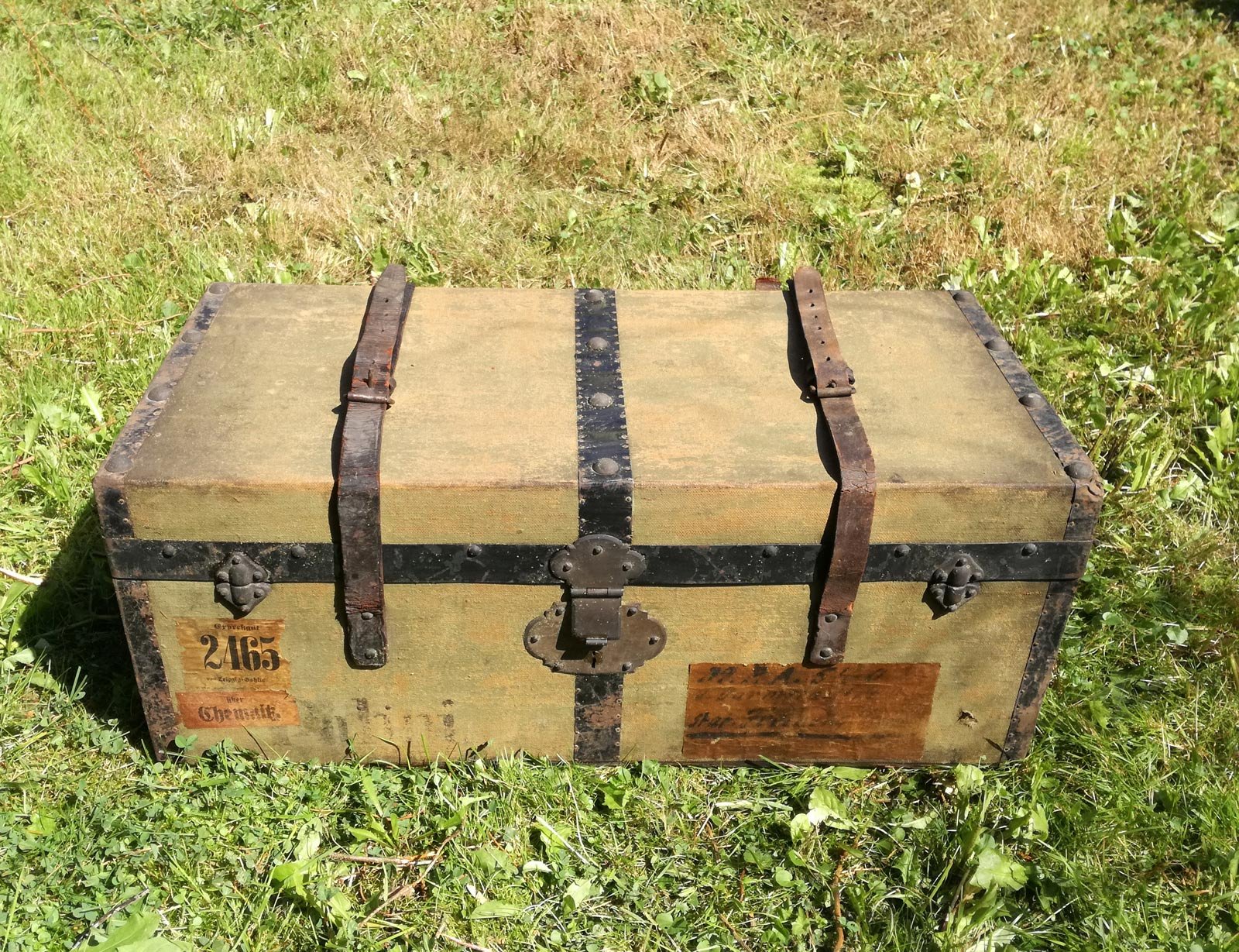 Reisekiste um 1880, Leinen, Holz mit Eisenbändern. Mit alten Etiketten und Adressaufklebern. Reinigungs- und pflegebedürftig. Ein Ledergurt gerissen. Maße 68 x 33 x 28 cm.