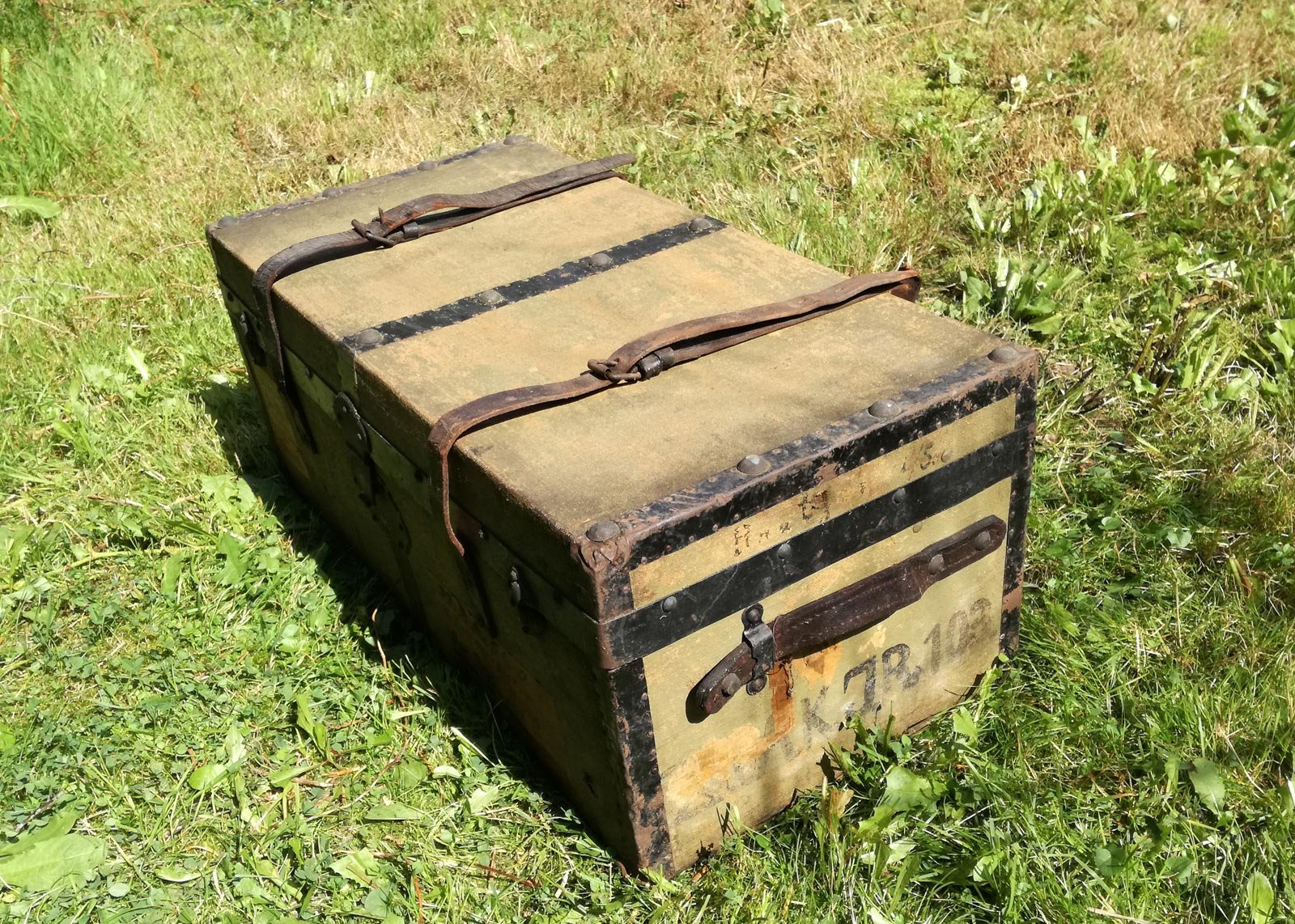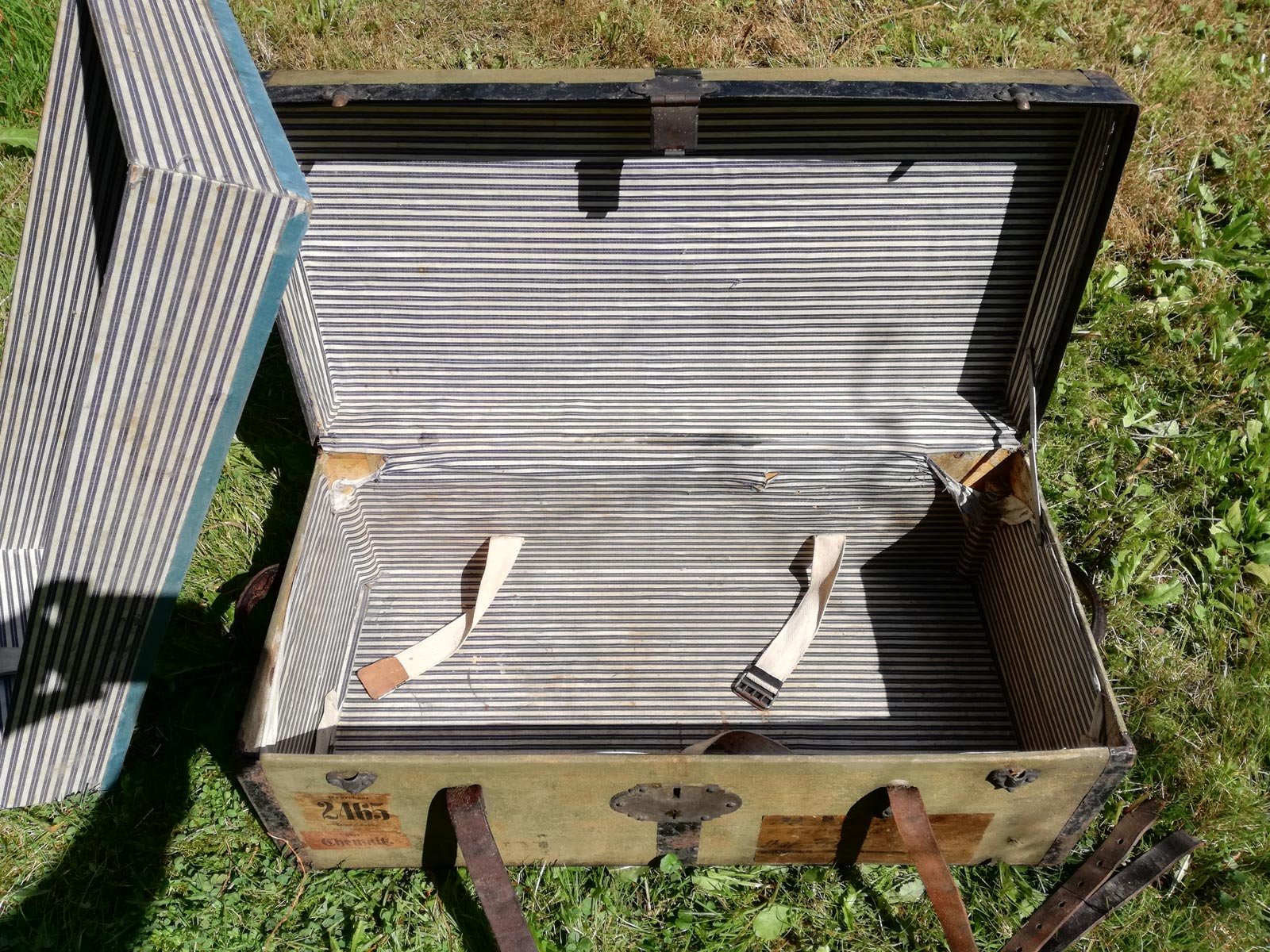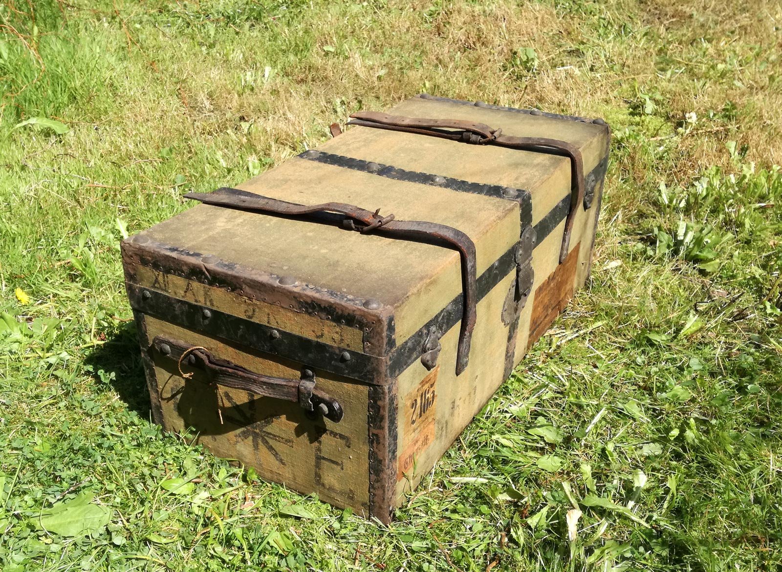 Reisekiste um 1880, Leinen, Holz mit Eisenbändern. Mit alten Etiketten und Adressaufklebern. Reinigungs- und pflegebedürftig. Ein Ledergurt gerissen. Maße 68 x 33 x 28 cm.
