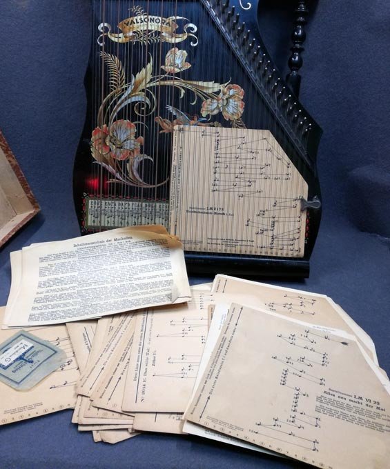 Zither, Valsonora Zither, orig Schlüssel, Karton und viele Notenblätte
