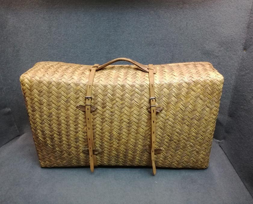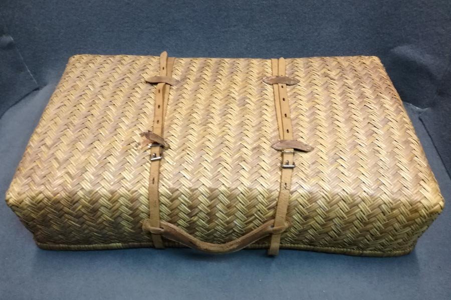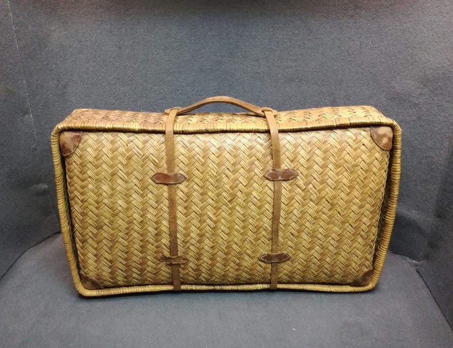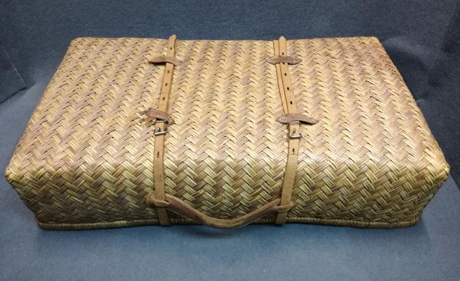 Alter geflochtener Koffer mit Lederriemen und Ledergriff. Zweischaliger Koffer. Sehr guter Zustand mit leichten Gebrauchsspuren, Zwei Lederlaschen lose. B. 66, H. 40, T. 17 cm.
