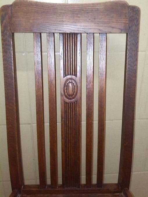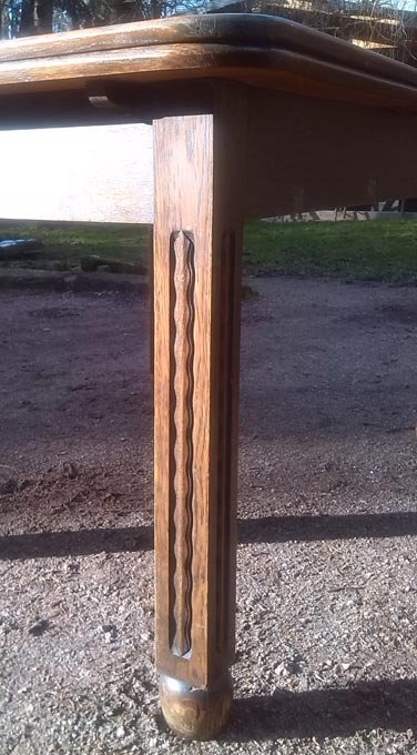 Stühle mit Verzierung in der Rückenlehne, Tisch mit geschnitztem Band in den Füßen. Sitzgruppe in gutem, nutzbaren Zustand mit geringen Gebrauchsspuren.