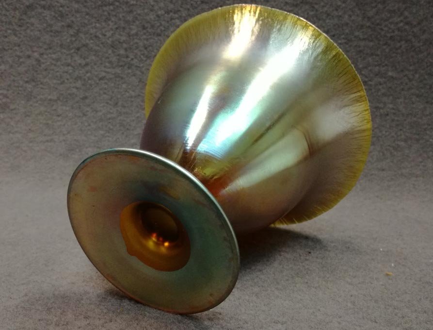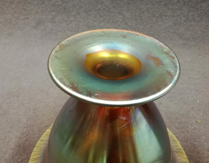 Glasvase Metall beschichtet, irisierend. Sehr schönes Farbspiel, kräftig changierend von Türkis bis Gold. Abriß ausgekugelt.