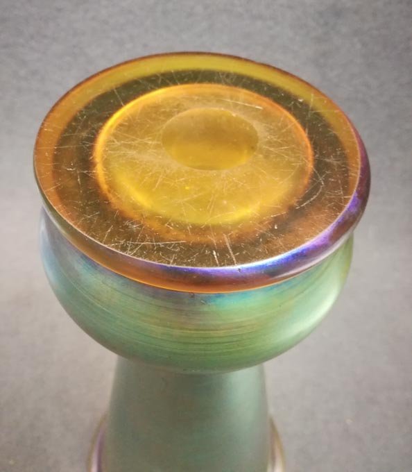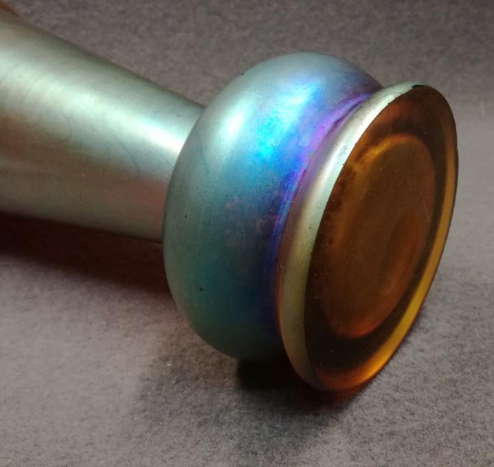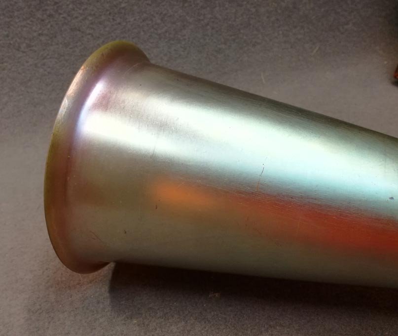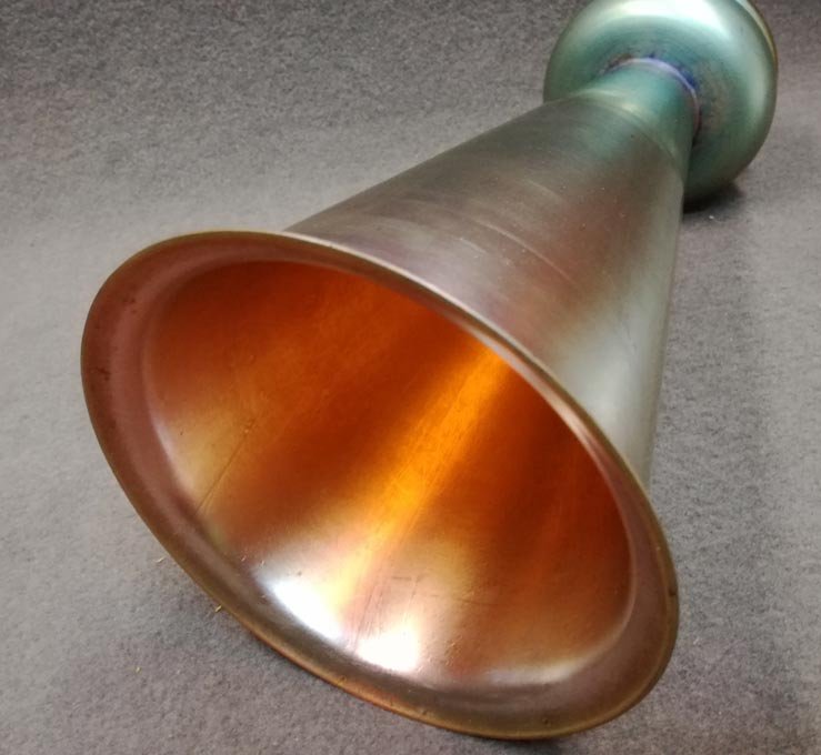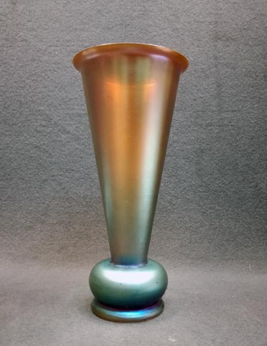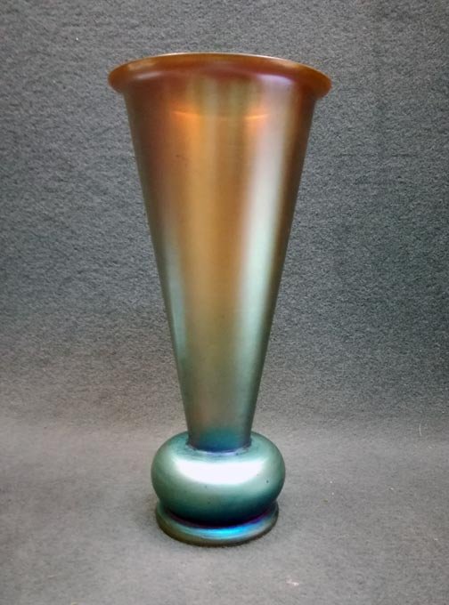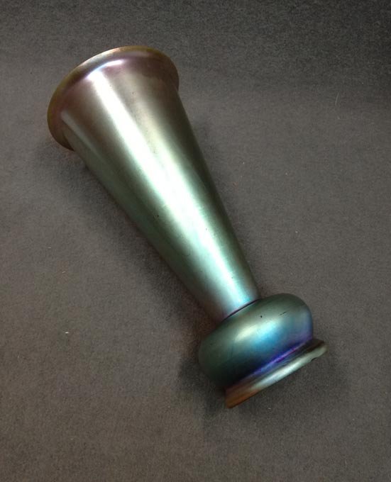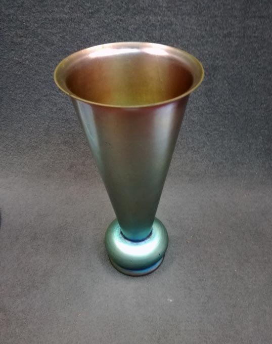Glasvase Metall beschichtet, irisierend. Sehr schönes Farbspiel, kräftig changierend von Türkis bis Gold. Abriß ausgekugelt.