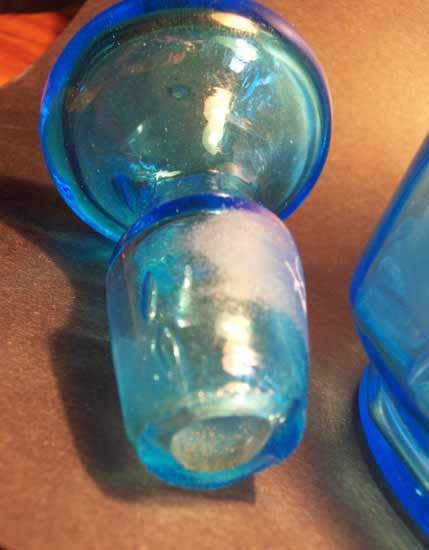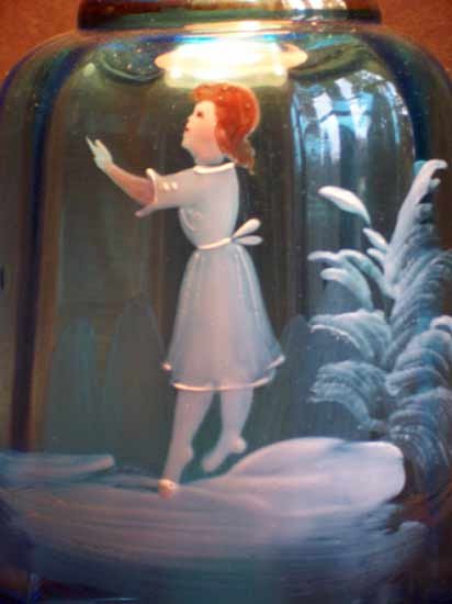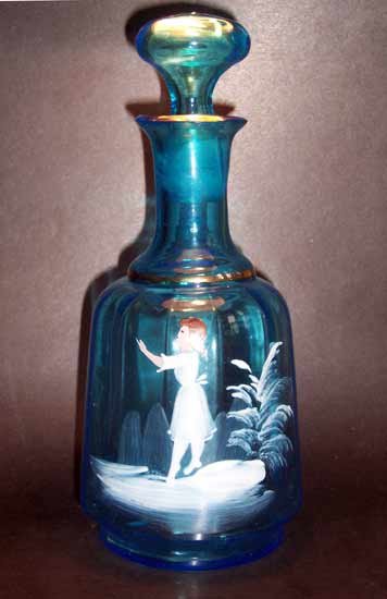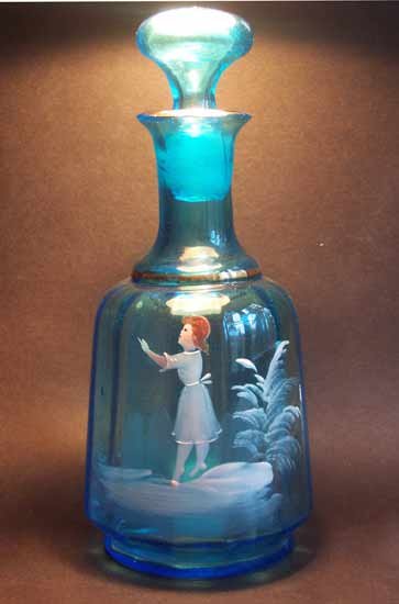 Karaffe mit Schneemalerei; blau getöntes Glas, teilw. vergoldet mit der Darstellung eines Mädchens in Landschaftsinsel.
