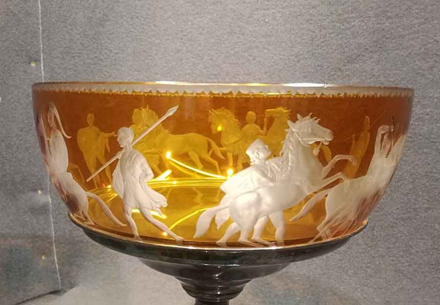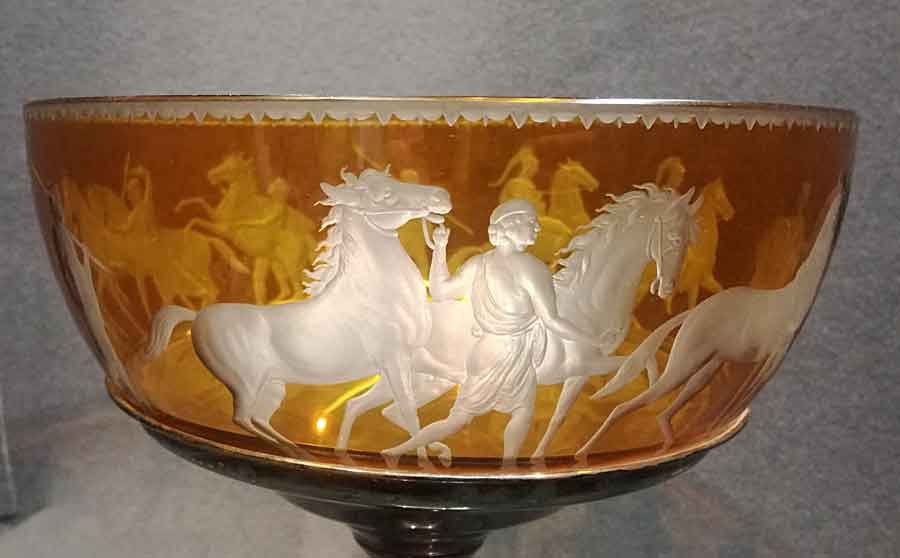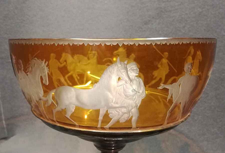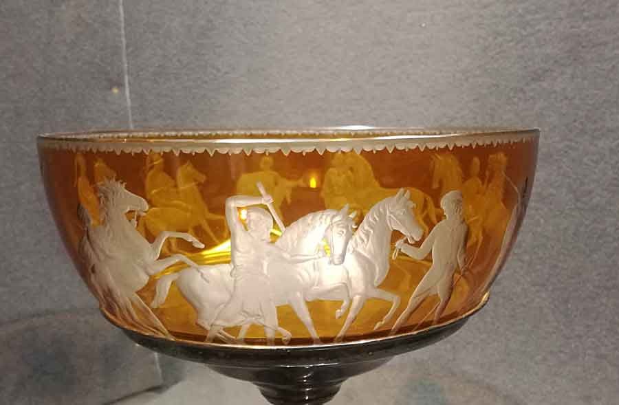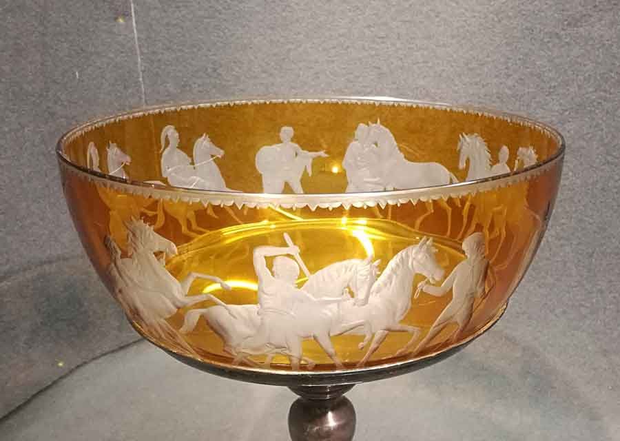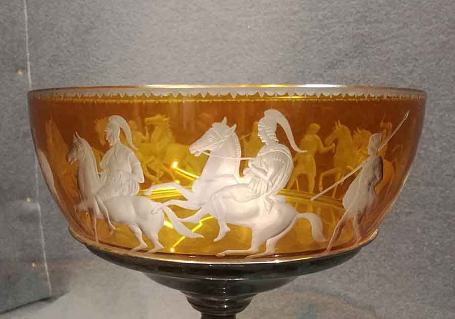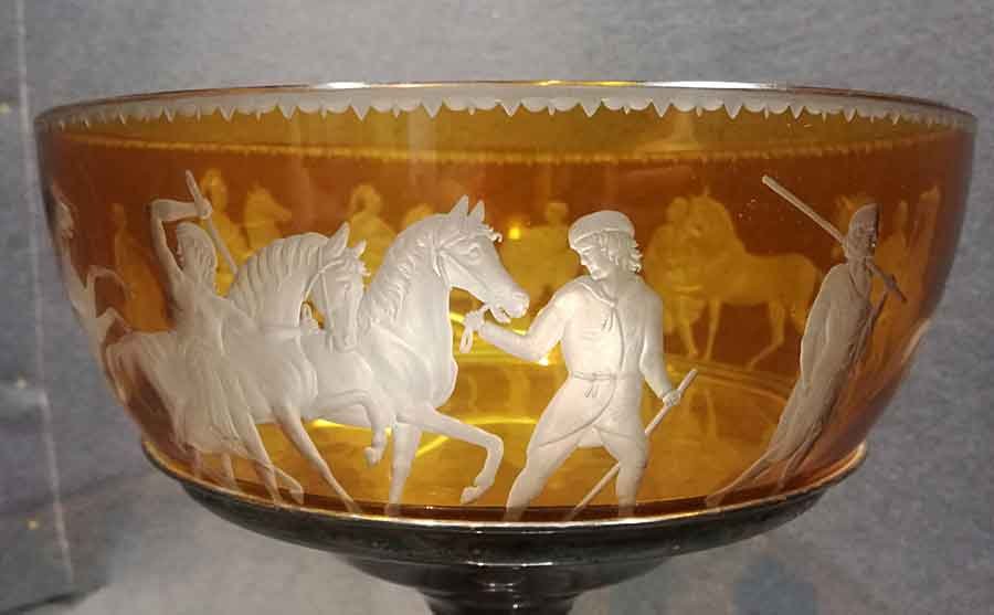 Tafelaufsatz, versilberter Fuß mit Glasschale bzw. breitem Glasring. Verm Böhmen? Farbloses Glas gelb-orange überfangen. Der Überfang als figürlicher Dekor ausgeschliffen. Hellenistische, klassisch antike Darstellung von Reitern, Soldaten, Pferden. Sehr aufwändiger und detailreicher Schliff. Faltenwürfe, Muskelspiel, Finger, Haare und Zähne der Pferde ect. deutlich und fein ausgearbeitet.