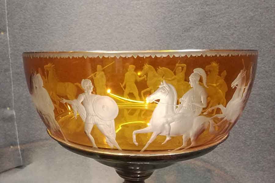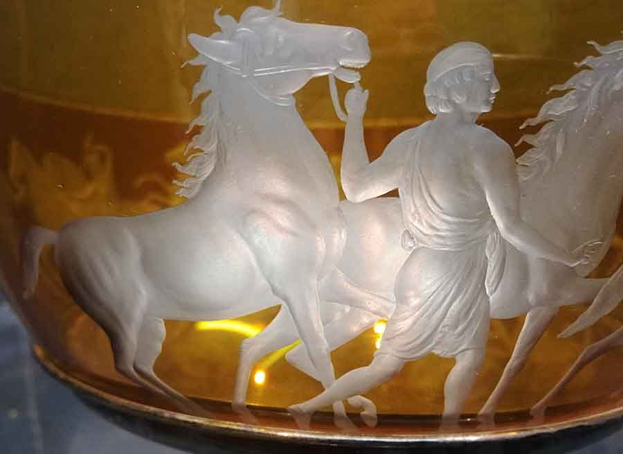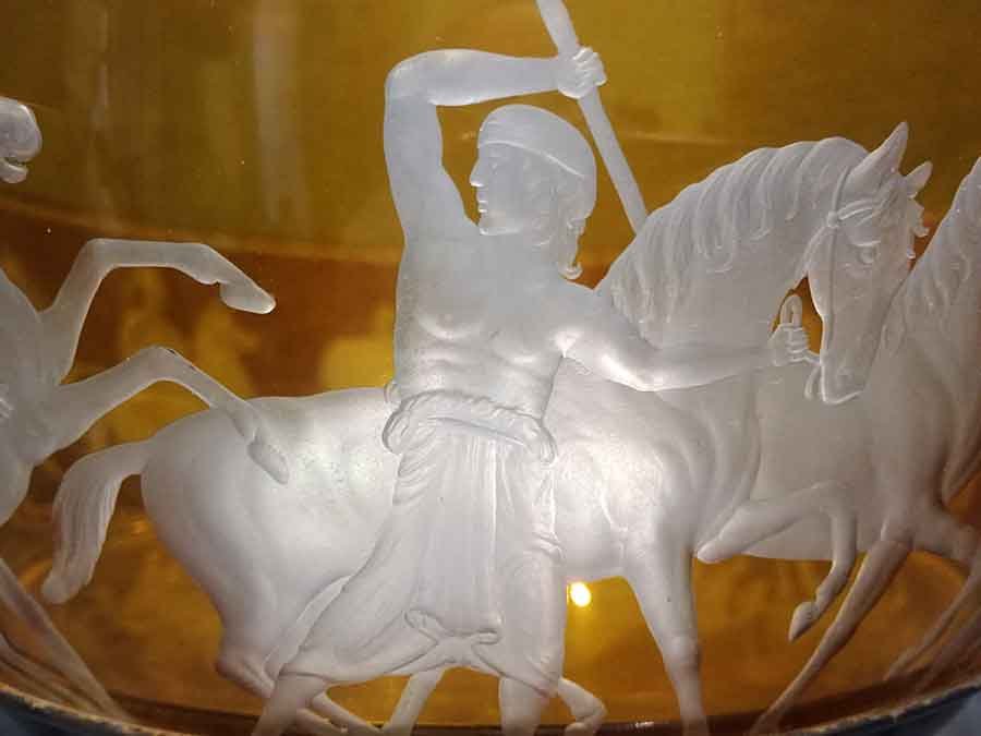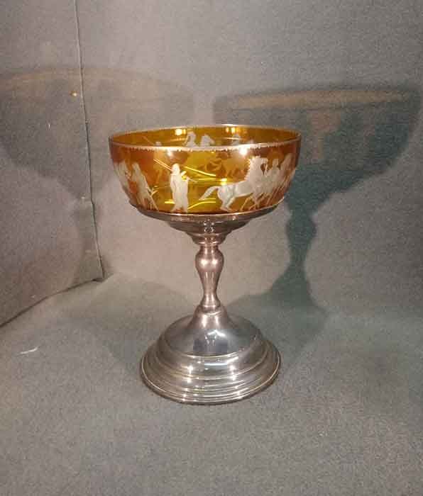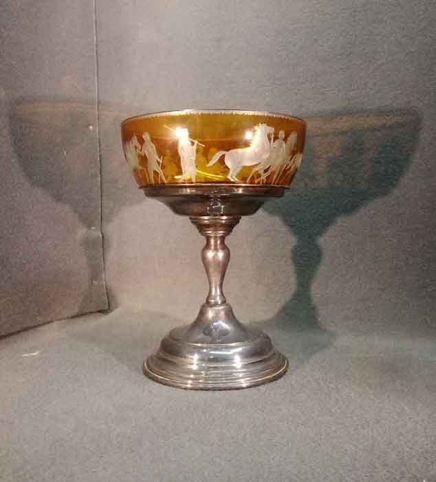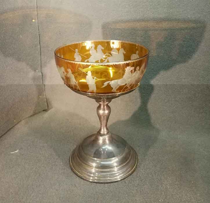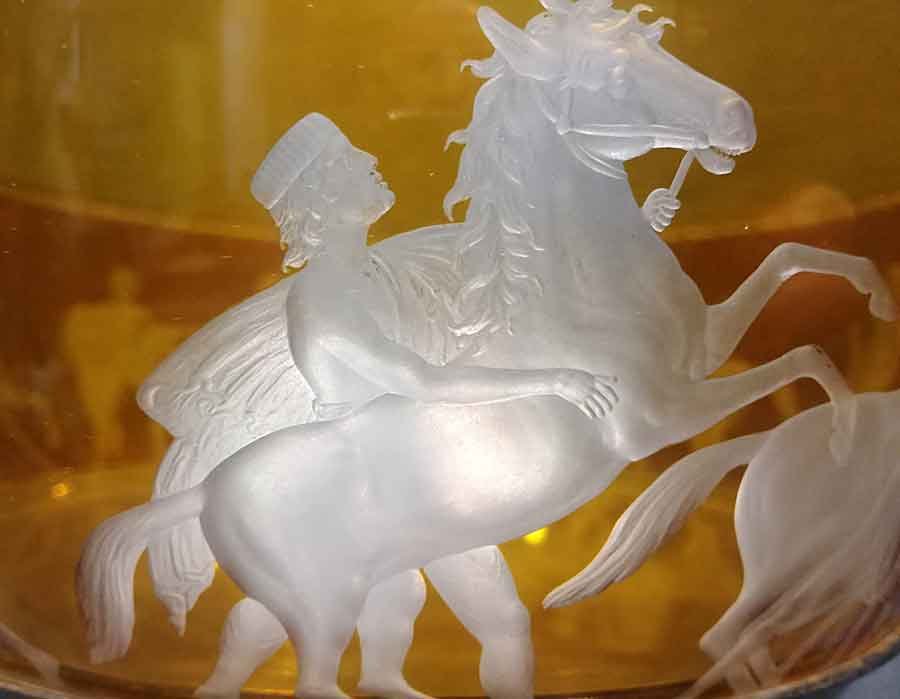 Tafelaufsatz, versilberter Fuß mit Glasschale bzw. breitem Glasring. Verm Böhmen? Farbloses Glas gelb-orange überfangen. Der Überfang als figürlicher Dekor ausgeschliffen. Hellenistische, klassisch antike Darstellung von Reitern, Soldaten, Pferden. Sehr aufwändiger und detailreicher Schliff. Faltenwürfe, Muskelspiel, Finger, Haare und Zähne der Pferde ect. deutlich und fein ausgearbeitet.