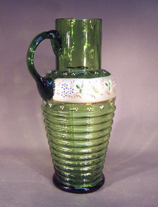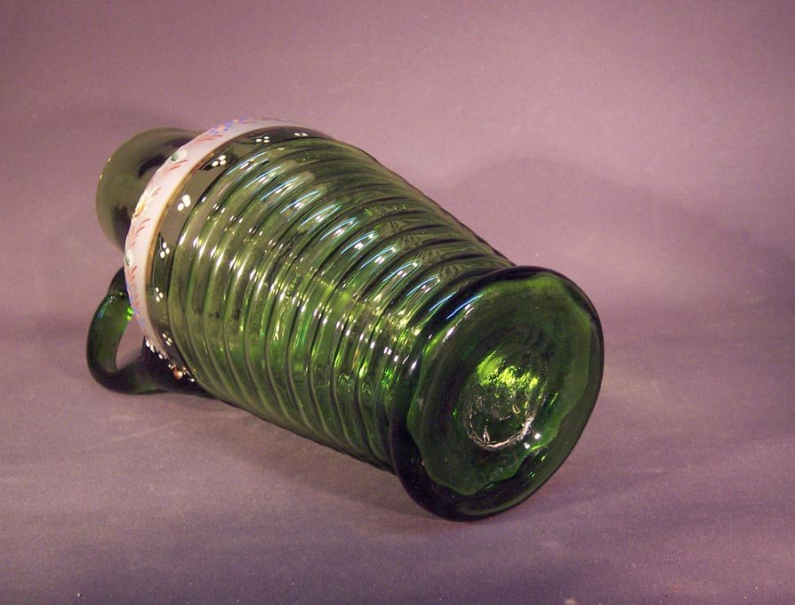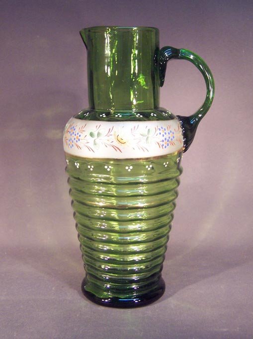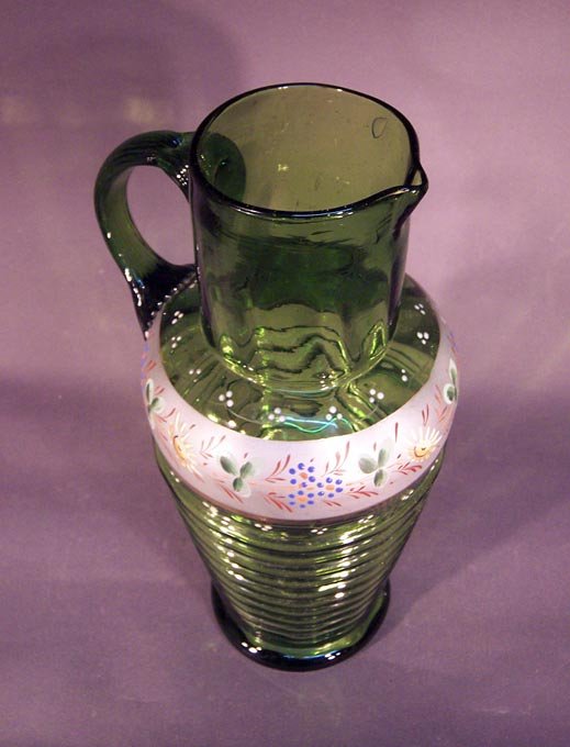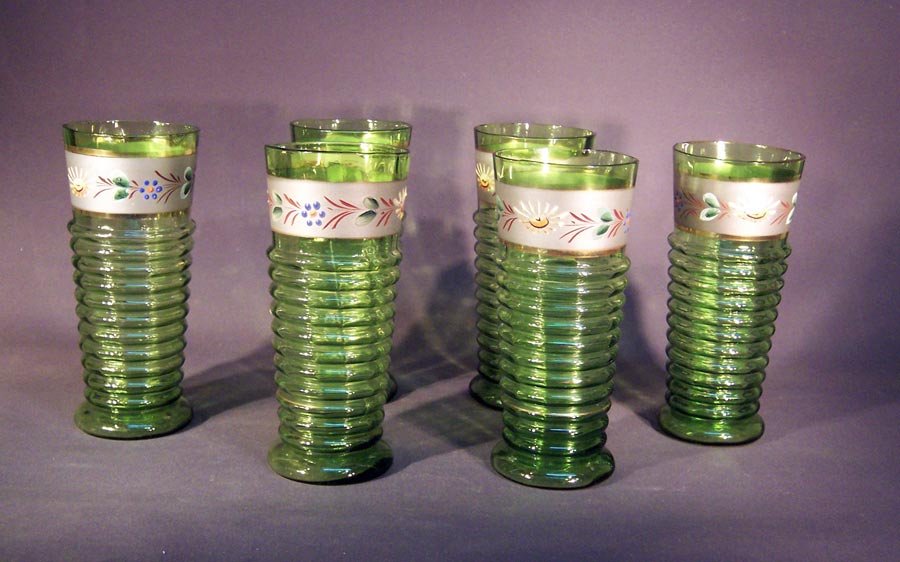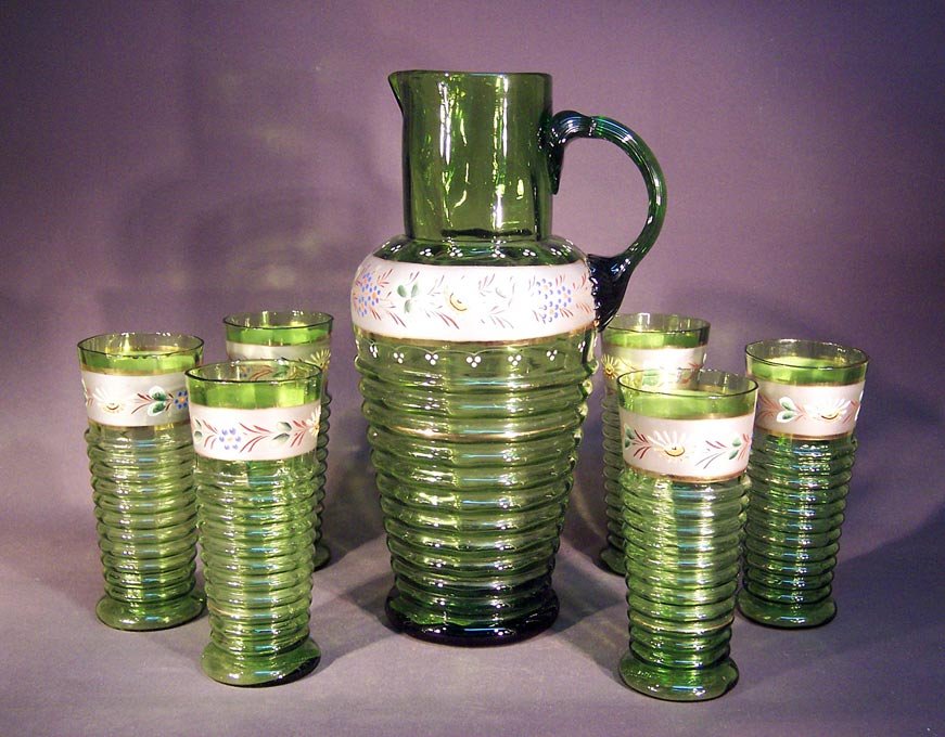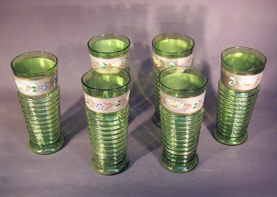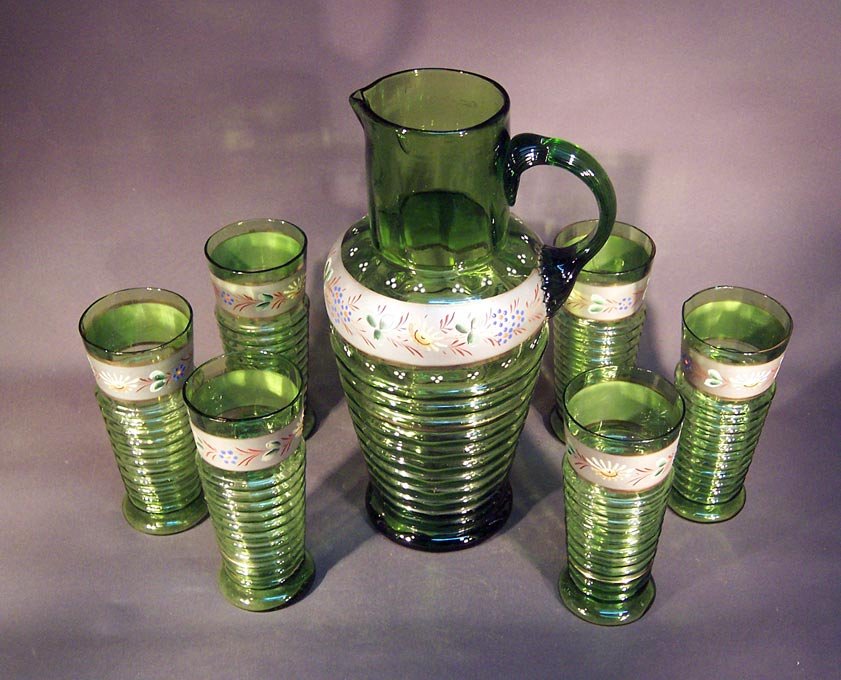 Krug und 6 Gläser, Abrissglas um 1850 -1900, grünes Glas mit Emaillemalerei und Gold.