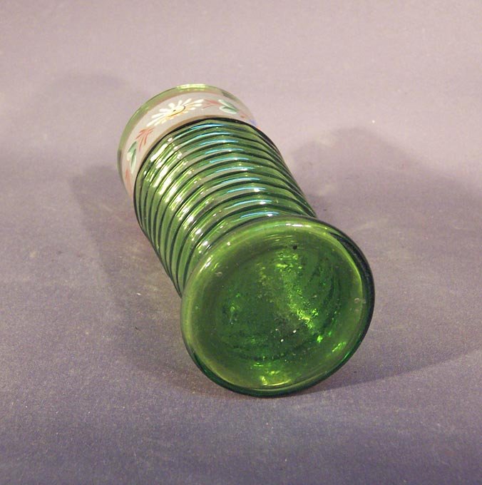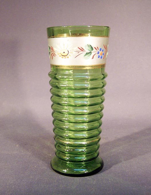 Glas im unteren Teil gewellt. Im oberen Teil mit Blumenband in Emaille sowie Goldrändern. Glas mit Lufteinschüssen.