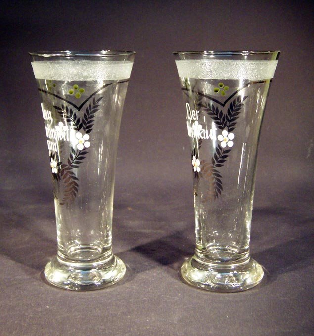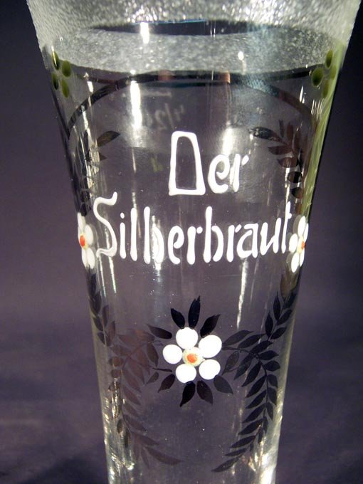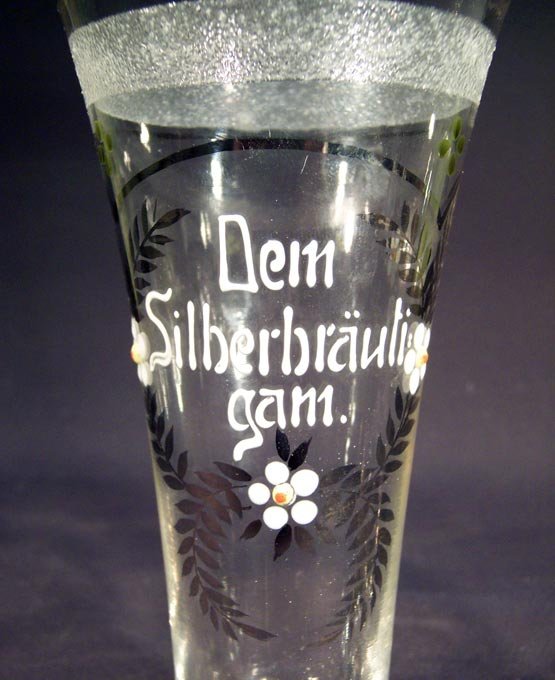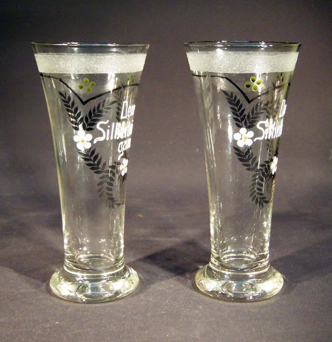 Zwei Gläser Silberhochzeit mit Emaillemalerei. "Der Silberbraut" und "Dem Silberbräutigam"