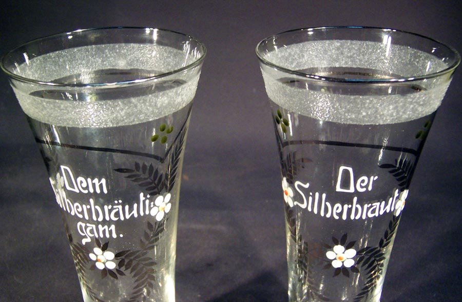 Silberhochzeit, zwei Gläser Der Silberbraut+ Dem Silberbräutigam, Emaillemalerei