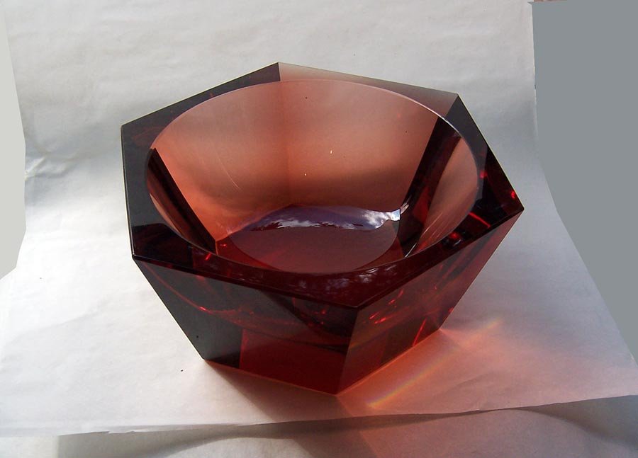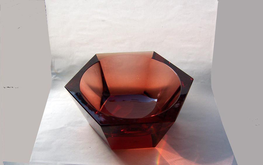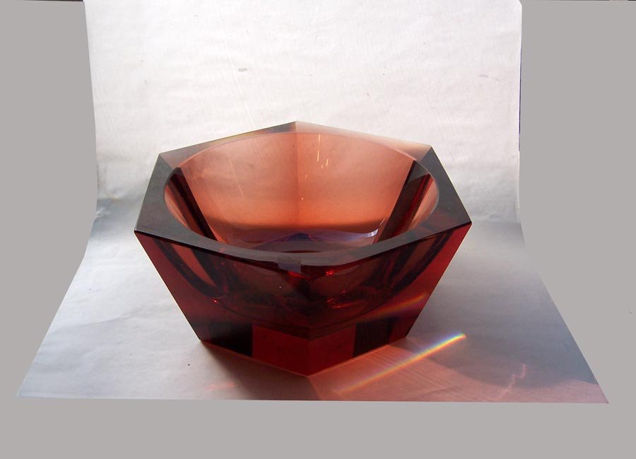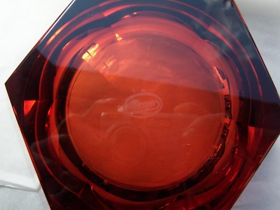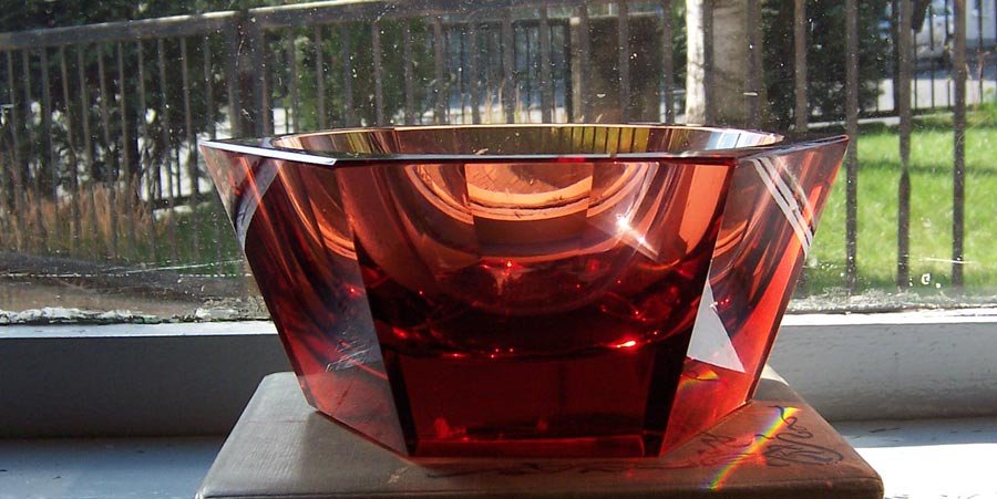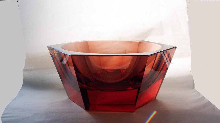 Schwere, massive, dickwandige Schale, mit großartiger Transparenz, großer Leuchtkraft und Vielfarbigkeit. 6-fach facettiert. Rötlich bis Bernstein. Moser, Karlsbad.