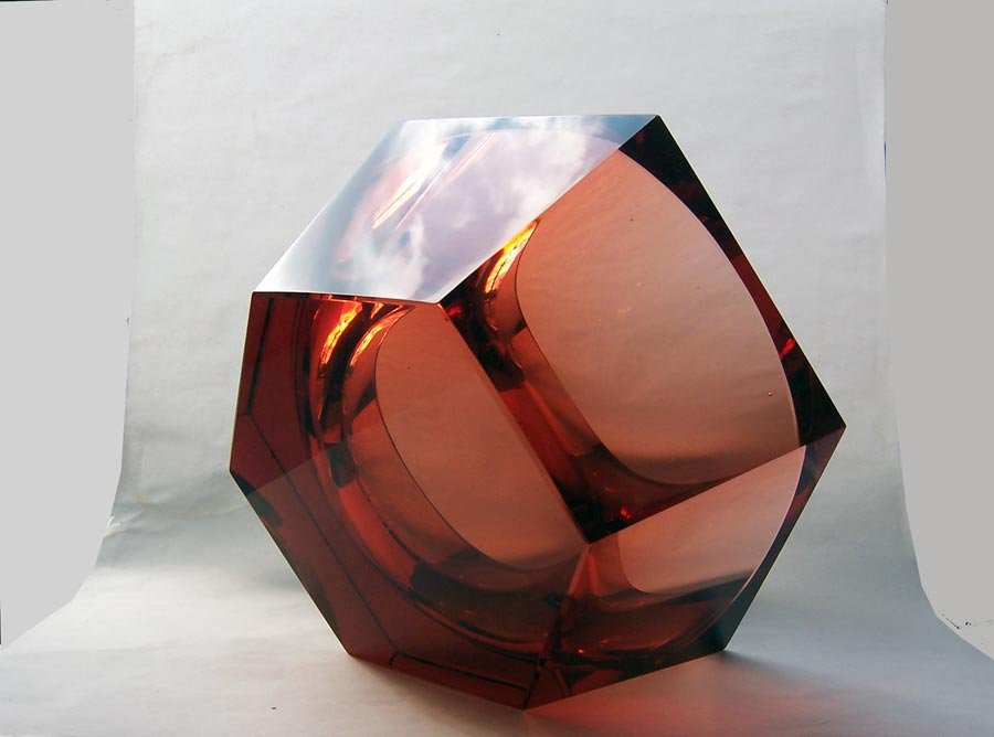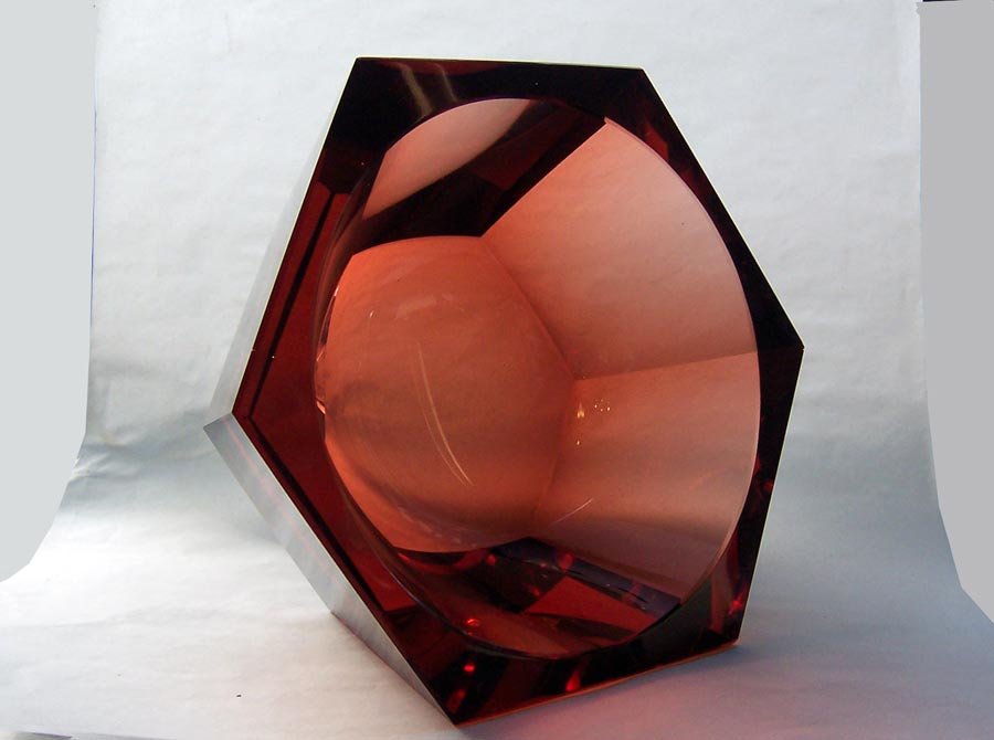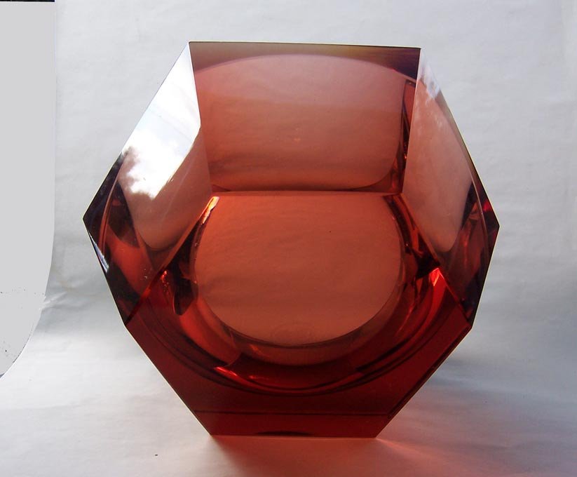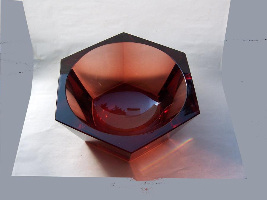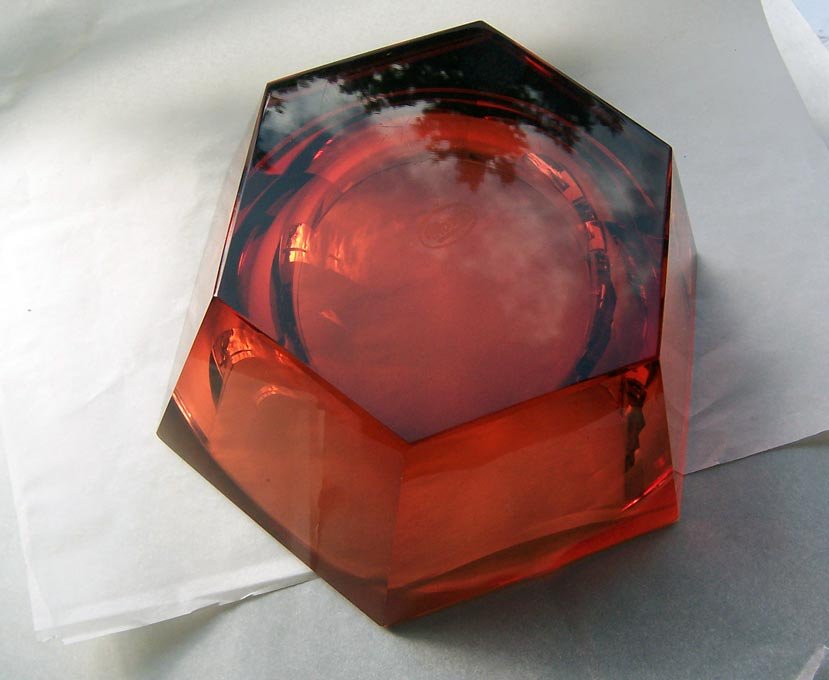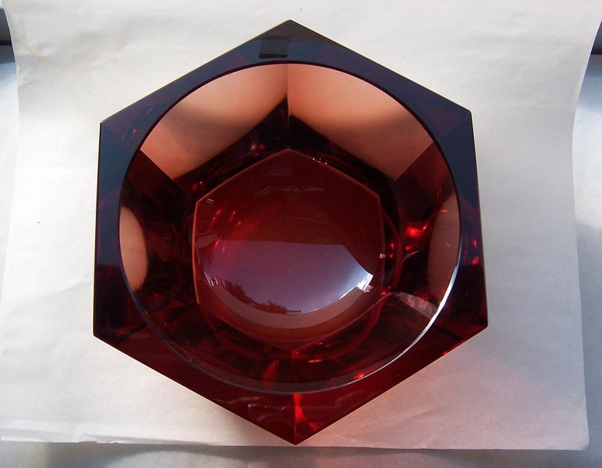 Schwere, massive, dickwandige Schale, mit großartiger Transparenz, großer Leuchtkraft und Vielfarbigkeit. 6-fach facettiert. Rötlich bis Bernstein. Moser, Karlsbad.