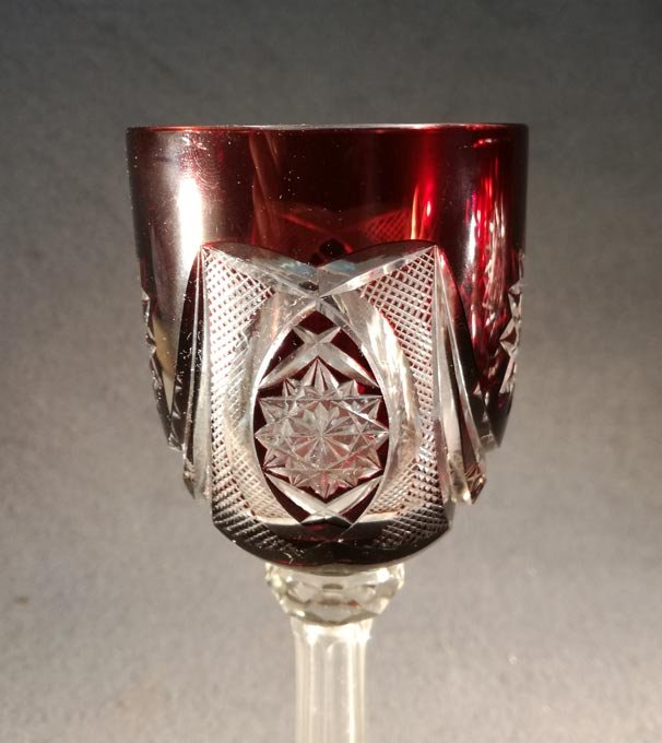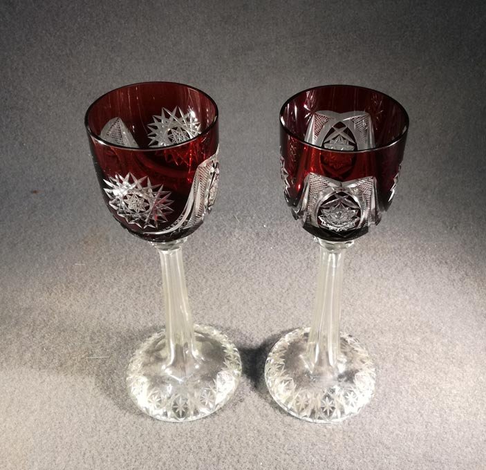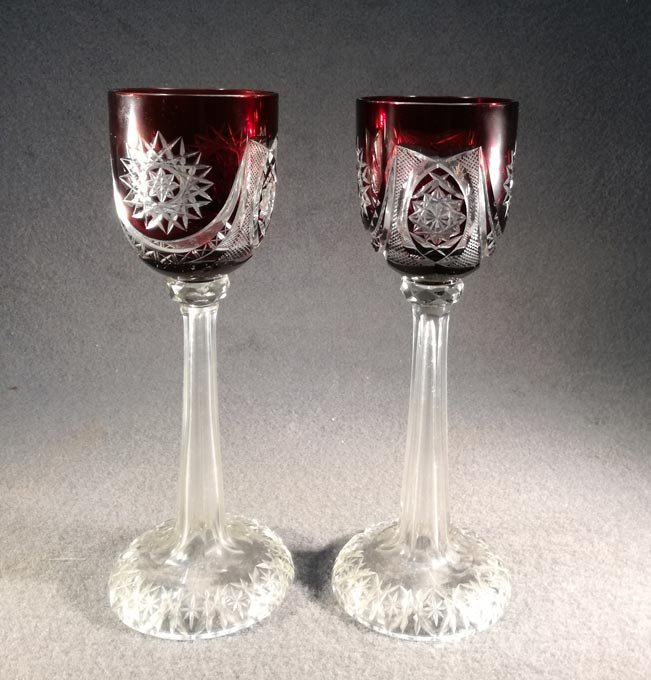 Zwei Römer, Kristall. Rote Kuppa, farbloser Schaft und Fuß, der Schaft hohl gearbeitet. H. 25 cm