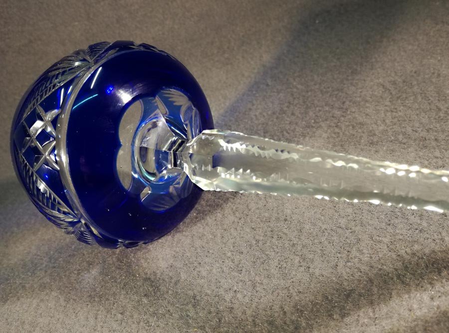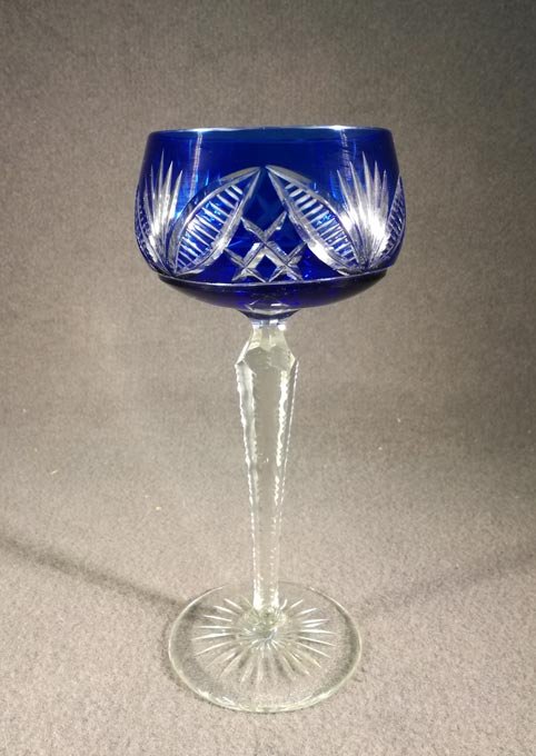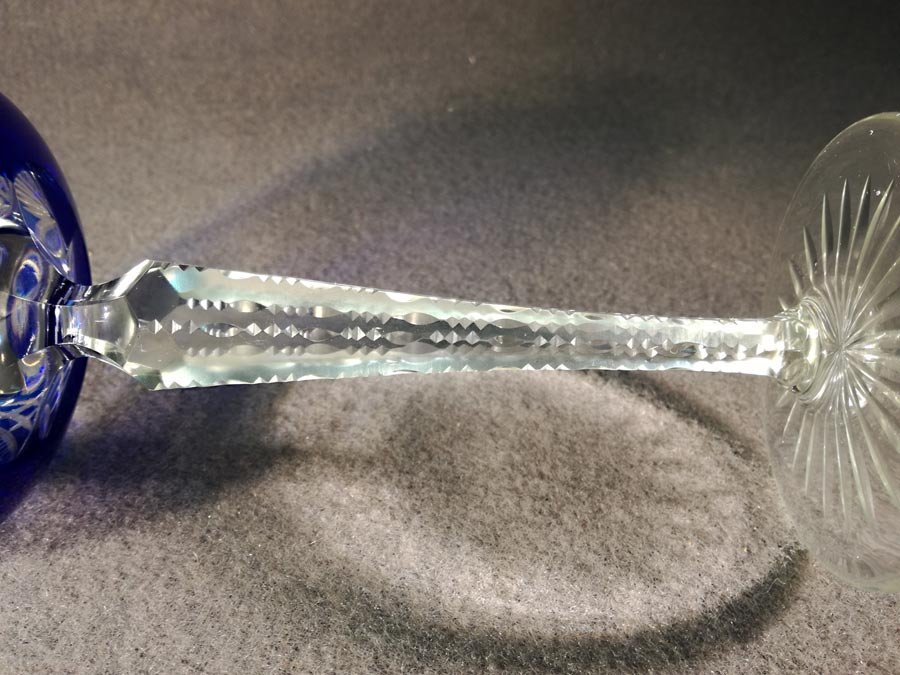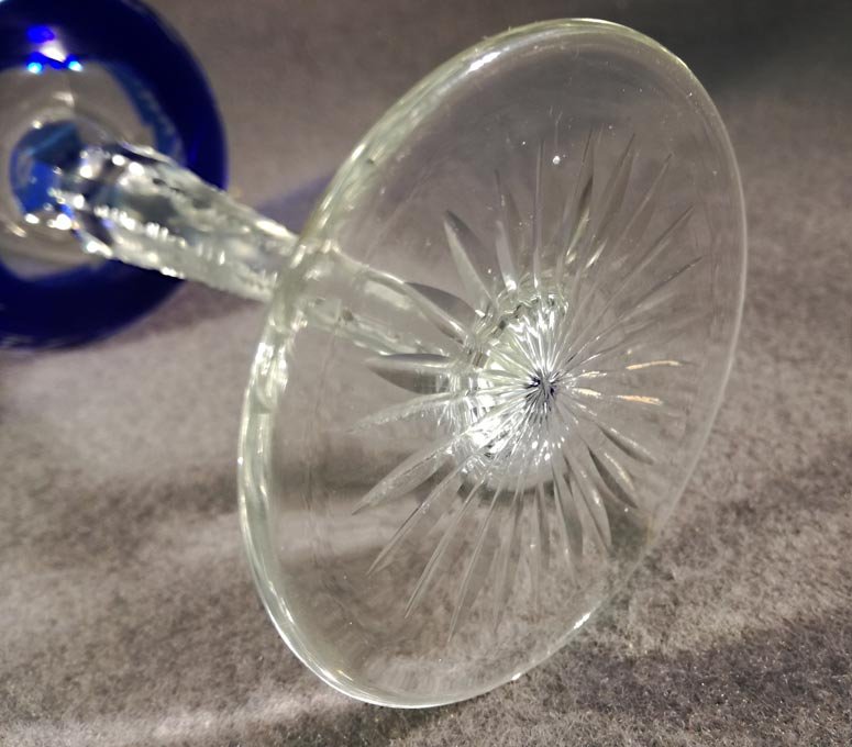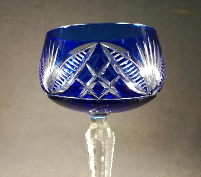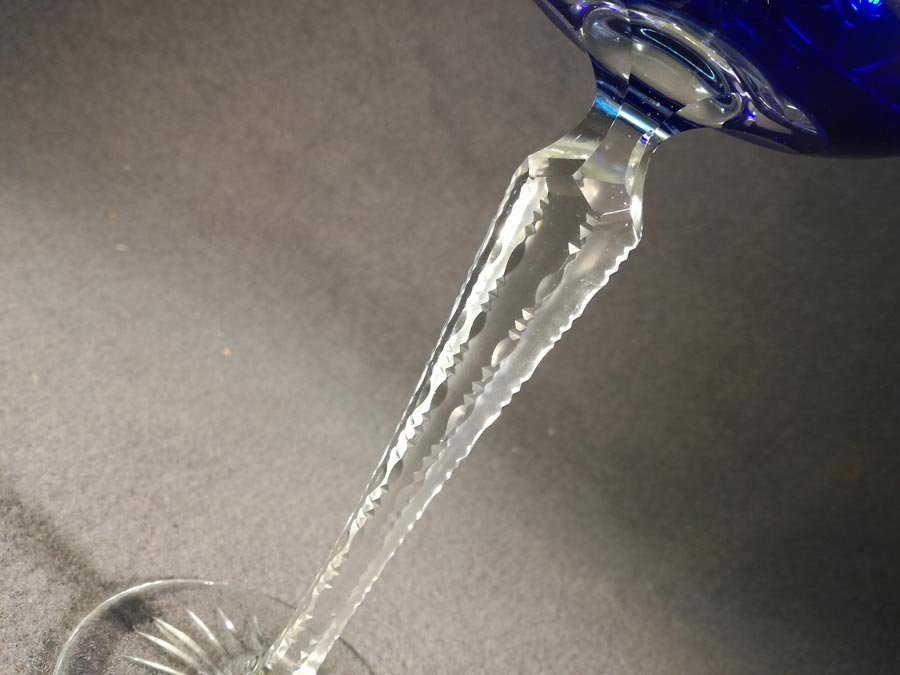 Römer, Weinrömer. Einer von Zwei. Blaues Kristallglas mit Schliff. Stengel mit 6 Facetten, oben eingezogen, die Kanten gekerbt. Im Boden Sternschliff.