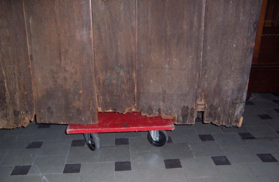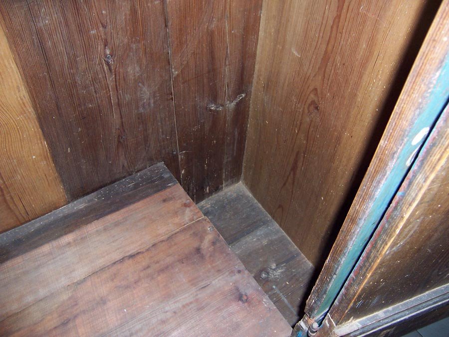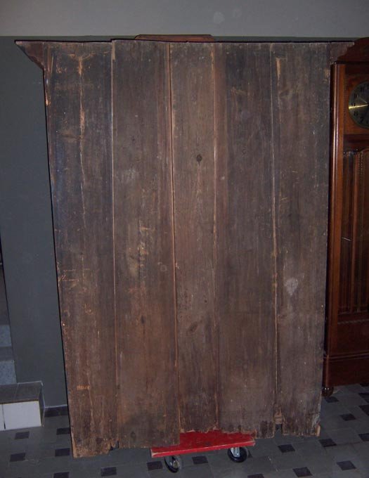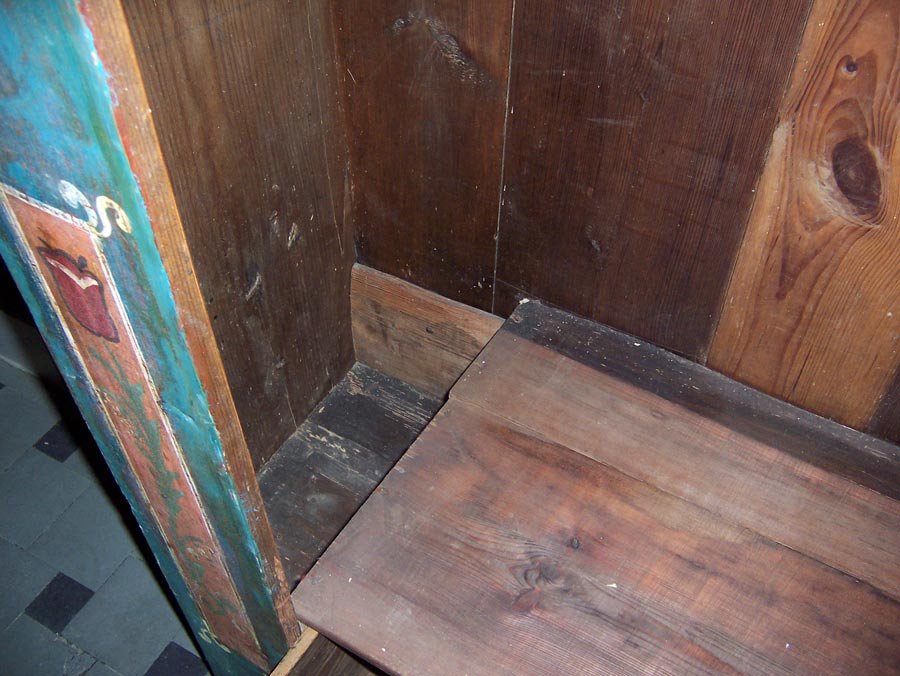 Im seitlichen Sockelbereich gibt es kleinere Bestoßungen. Rückwand im unteren Bereich mit sehr altem Feuchtigkeitsschaden, fest und stabil. Kranzleiste vermutl. alt restauriert tw. erneuert. Im seitl. Sockelbereich gibt es ältere, sehr gut ausgeführte Restaurierungen. Innen mit originalen Hakenleisten.