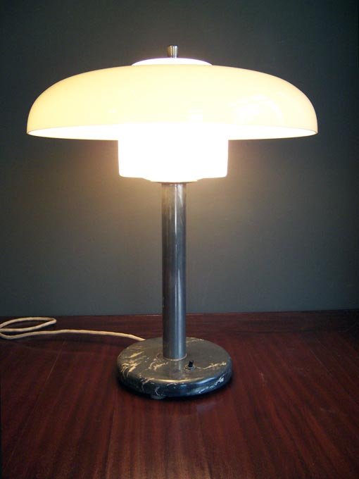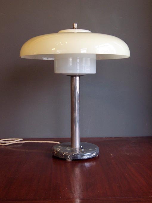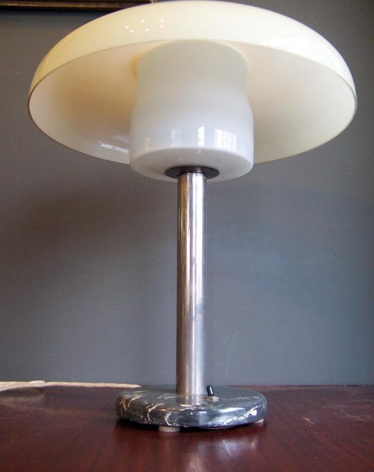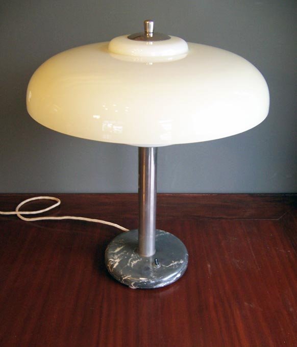 ART DECO Schreibtischlampe. Großer ausladender Glasschirm auf runder Metallsäule mit Marmorfuß.