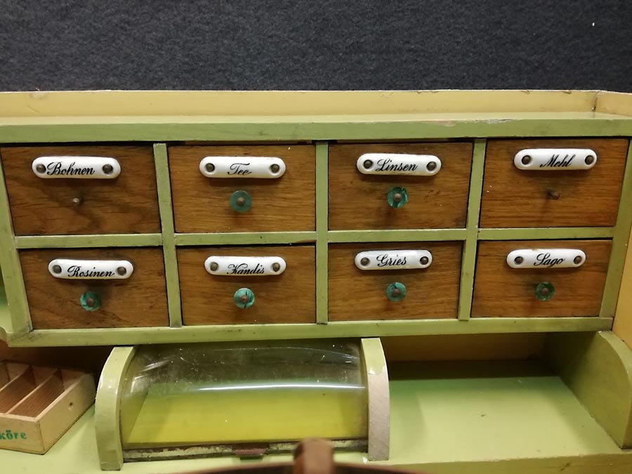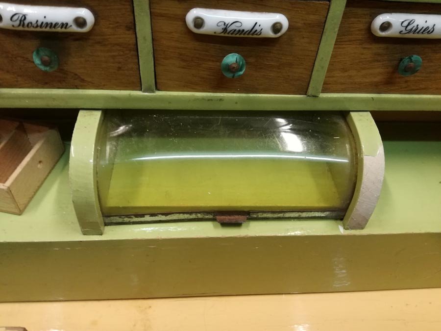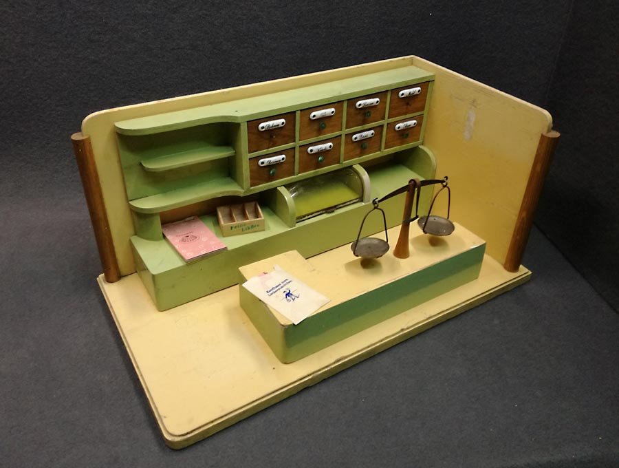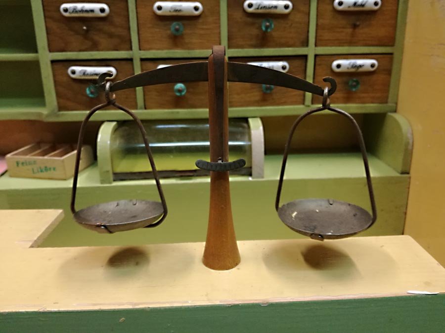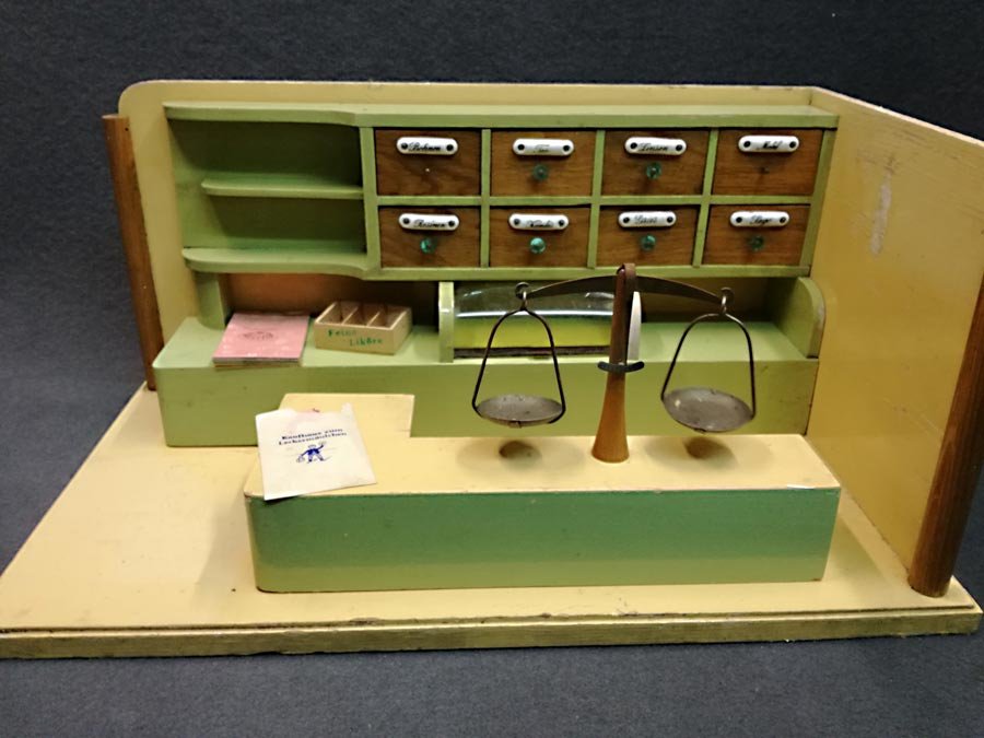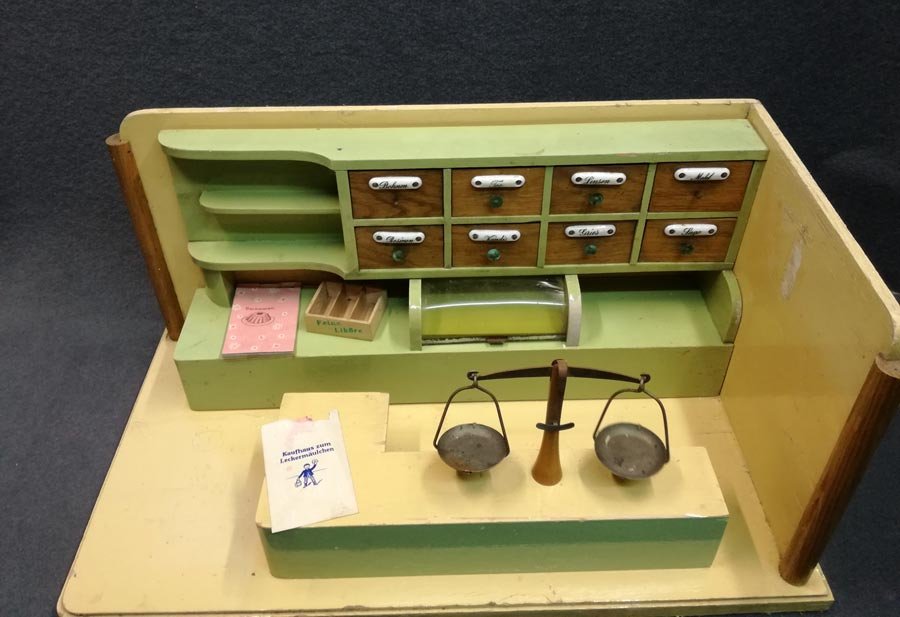 Kleiner Kaufmannsladen. Acht Vorratskästen (Schübe) mit original Porzellanschildern beschriftet, Verkaufstresen mit Balkenwaage, Gebäckkasten. Bespielt, normale Gebrauchsspuren,  einige Farbabplatzer bzw. Farbfehlstellen etc. Insgesamt schöner Zustand. B. 51 cm, T. 28 cm, H. 23 cm