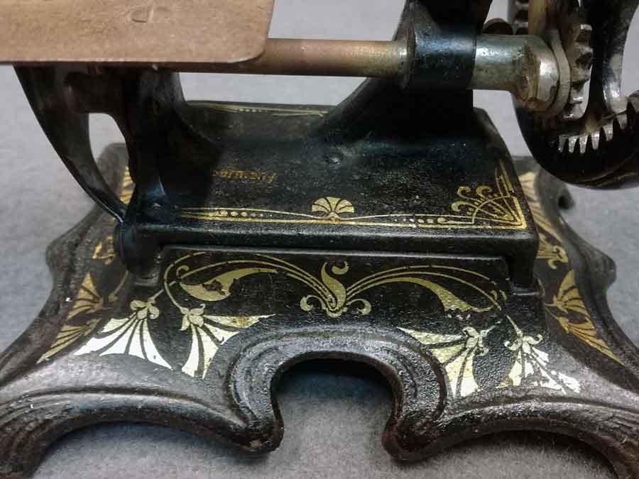 Gestell massiv Eisen, ebenso das Kurbelrad, kein Blech. Form und Dekor Jugendstil.