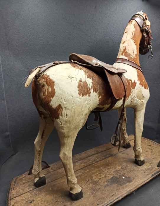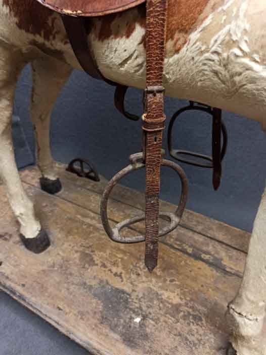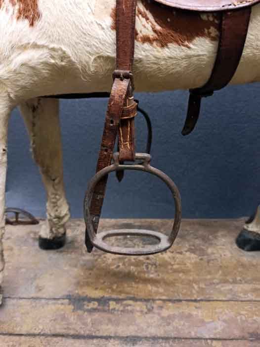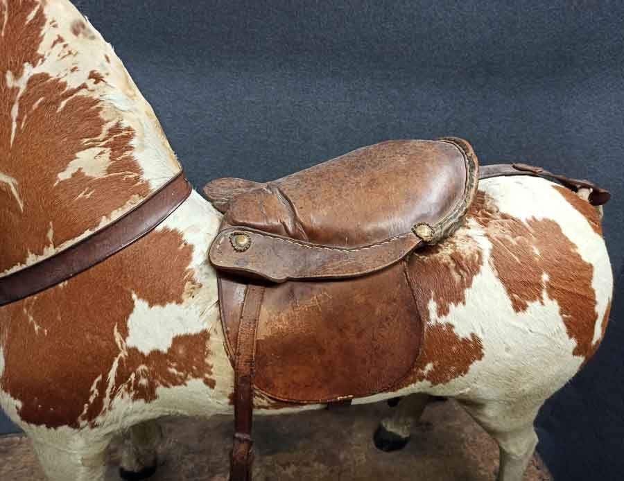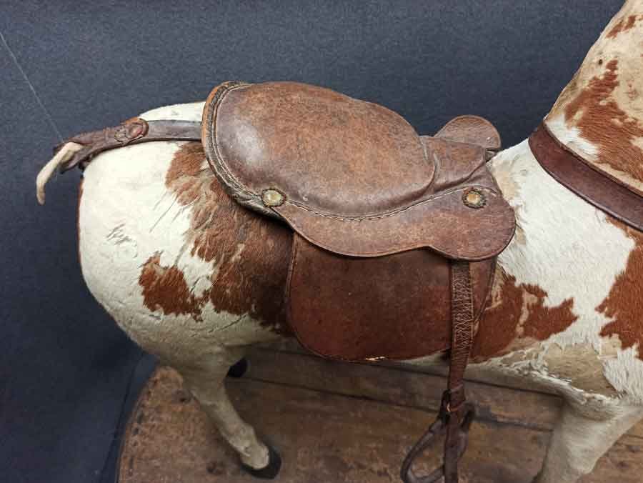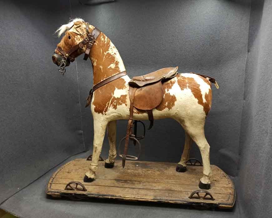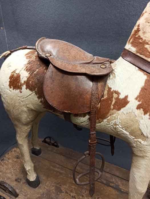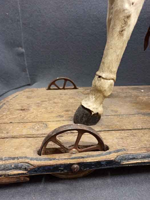 Großes Zieh Pferd auf Gusseisen Rädern, Echtfell und Glasaugen. Zaumzeug und Sattel aus Leder, Eiserne Steigbügel.