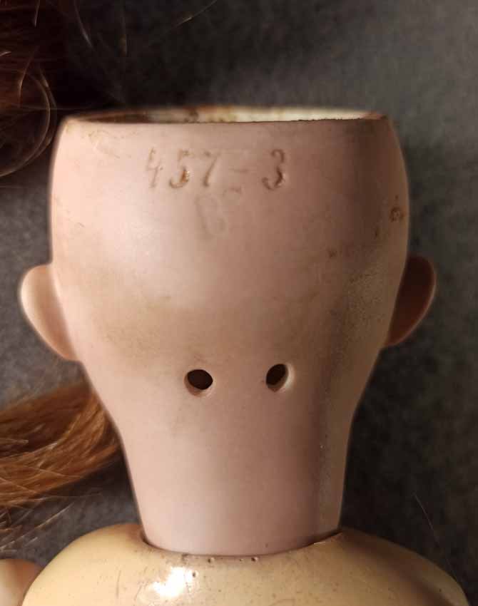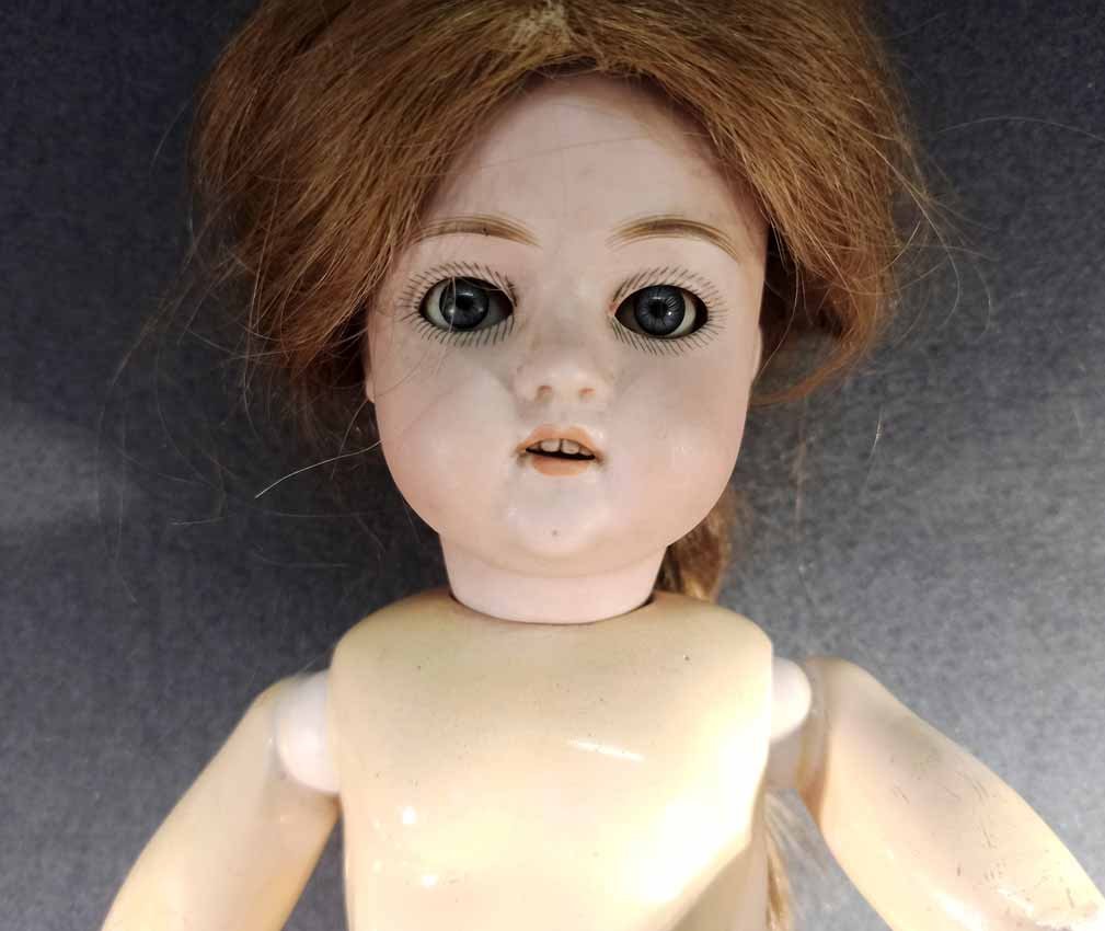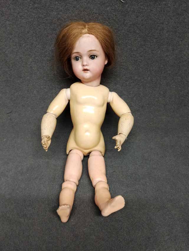 Porzellankopfputte mit Gliederkörper E.19.Jh. Puppenkopf mit Schlafaugen, Zähnchen und Echthaarperücke. Gemarkt versch. Nummern und Zeichen am Hinterkopf. Diese nicht gedeutet.  H. ca 27 cm