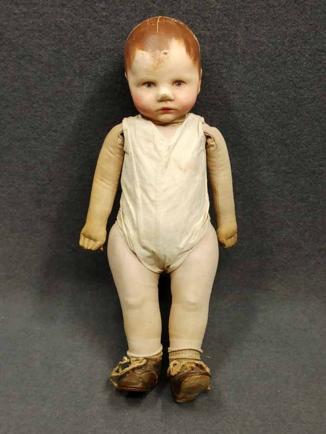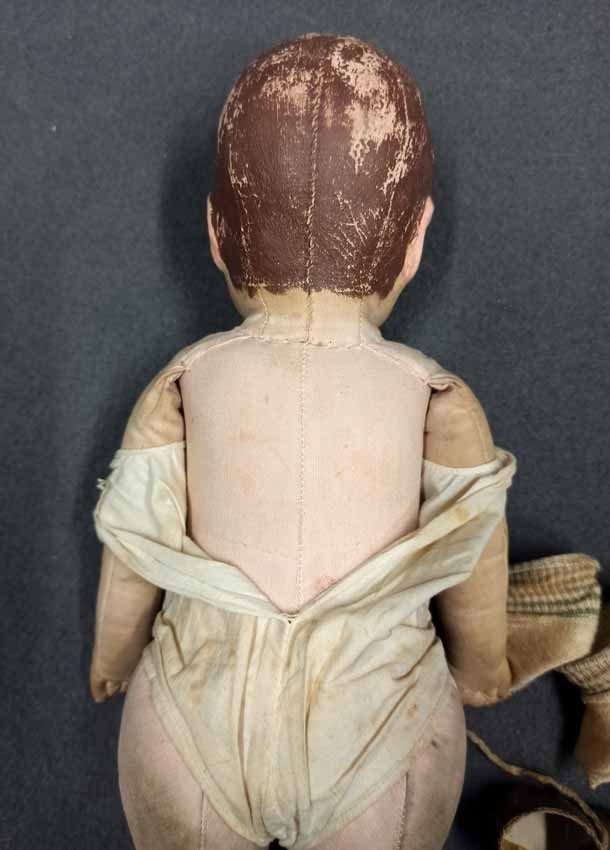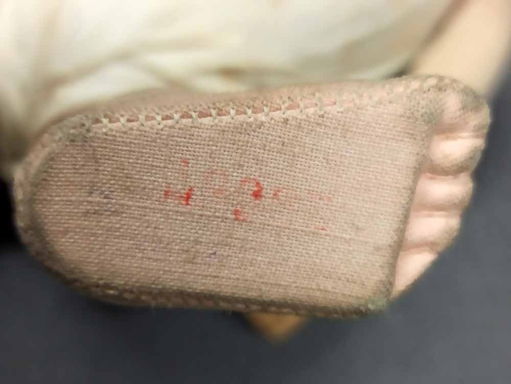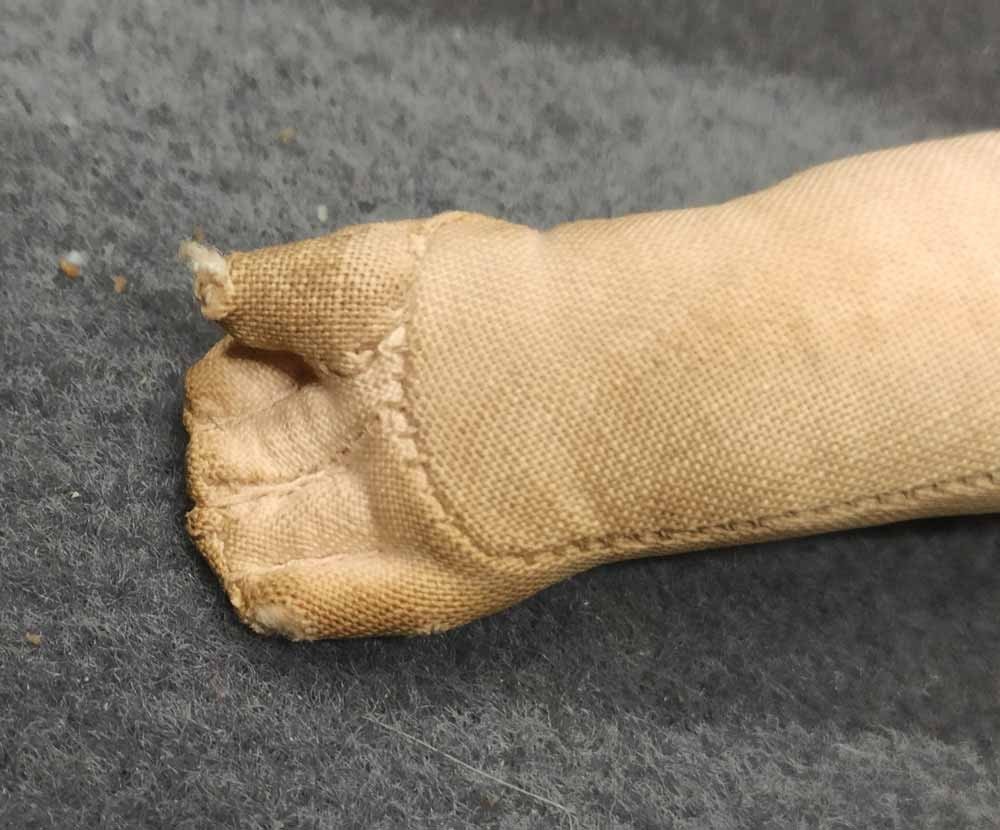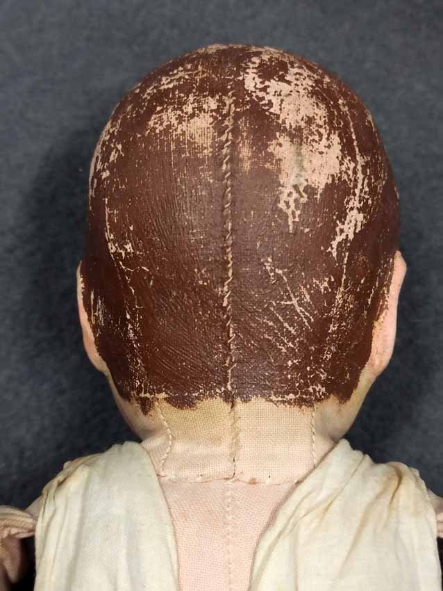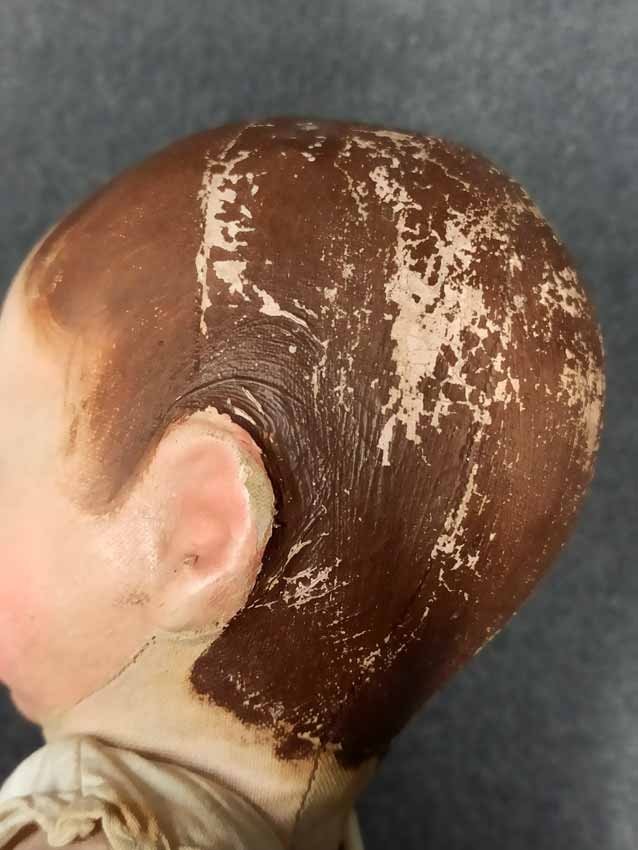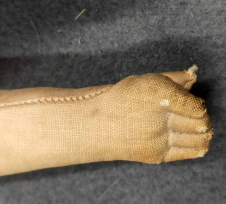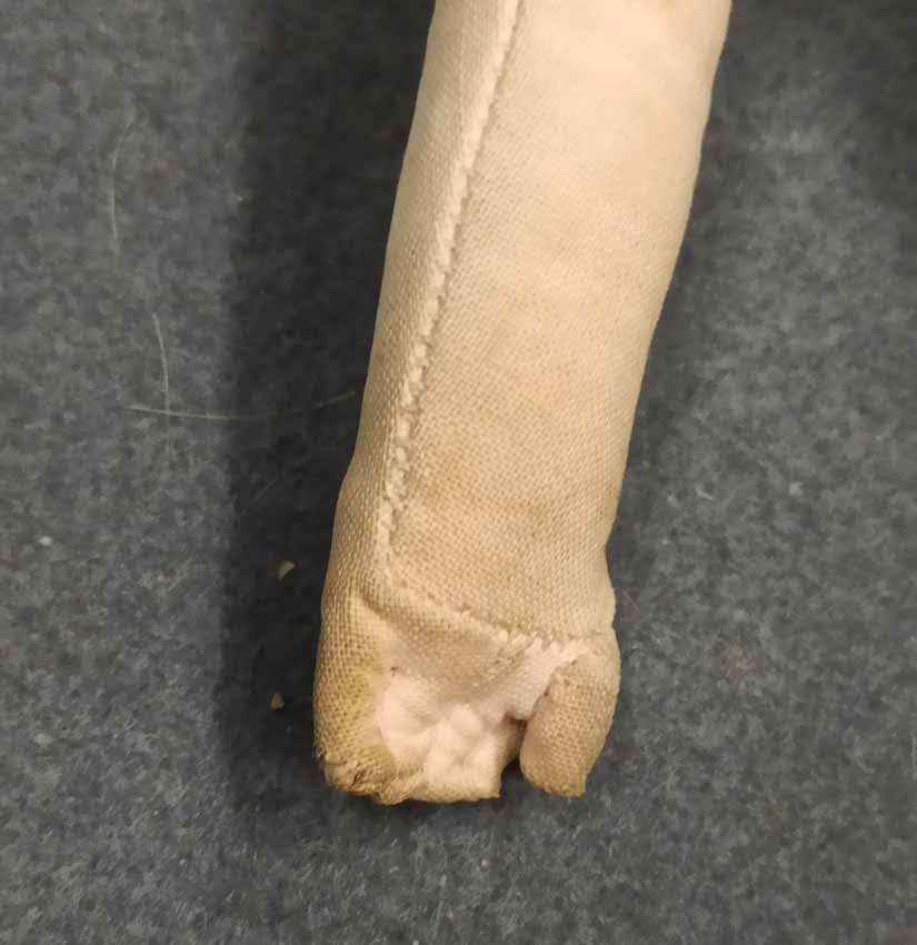 Separat genähter Daumen, breite Hüften, drei Kopfnähte. L. 35 cm. Zustand siehe Fotos. Beschreibung folgt.
