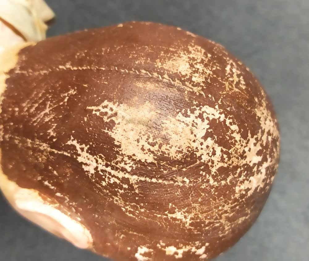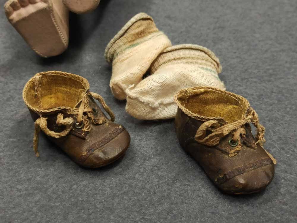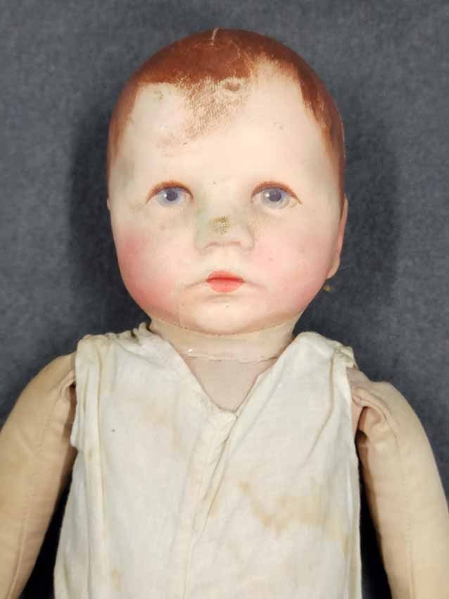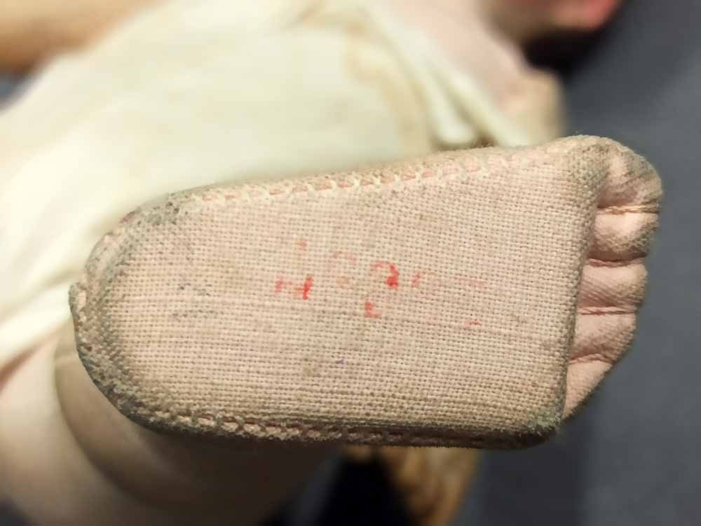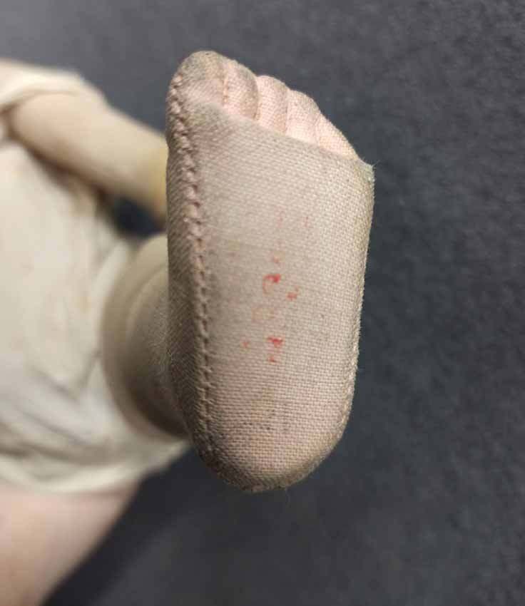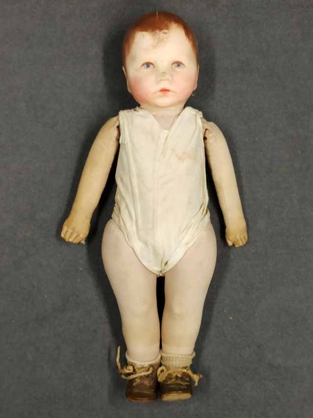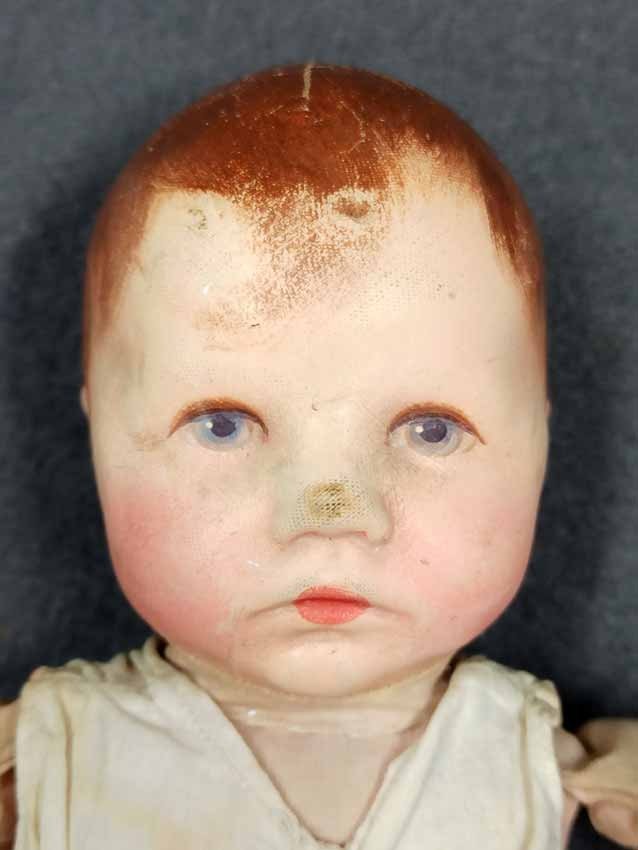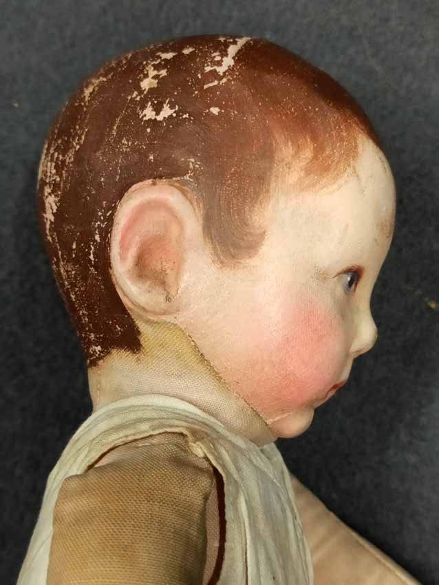 Separat genähter Daumen, breite Hüften, drei Kopfnähte. L. 35 cm. Zustand siehe Fotos. Beschreibung folgt.