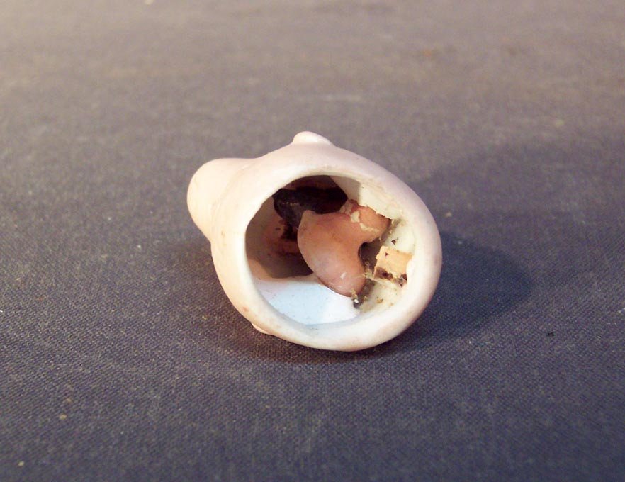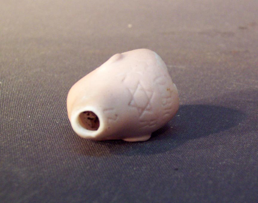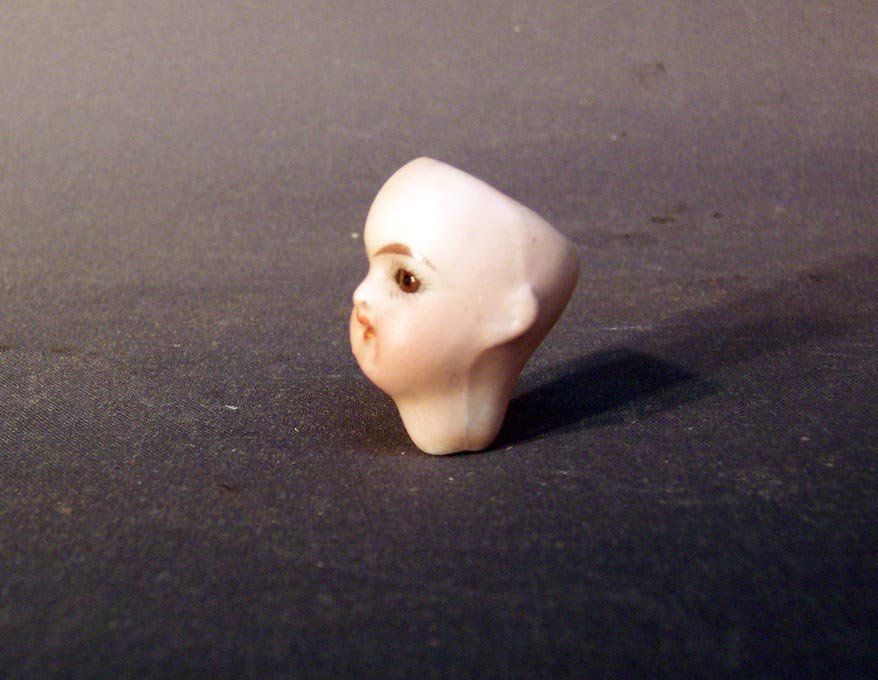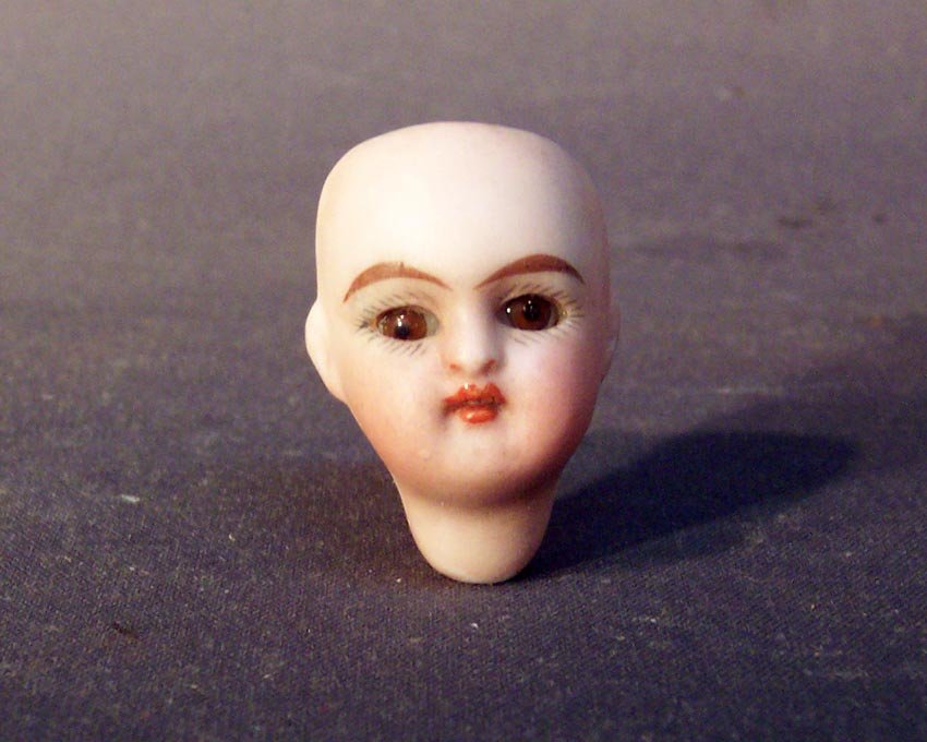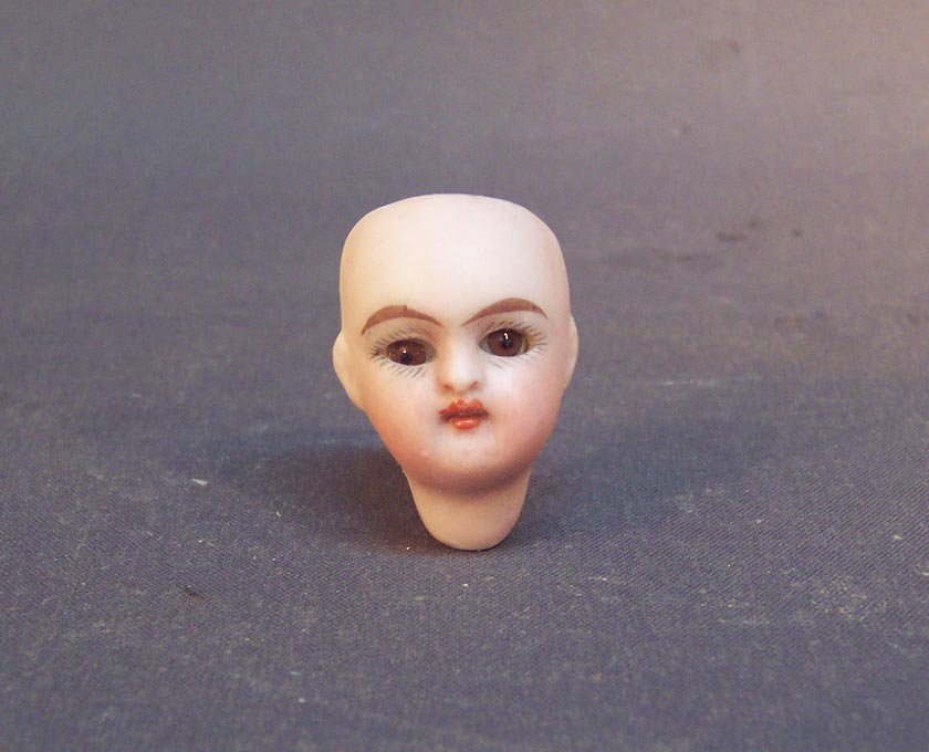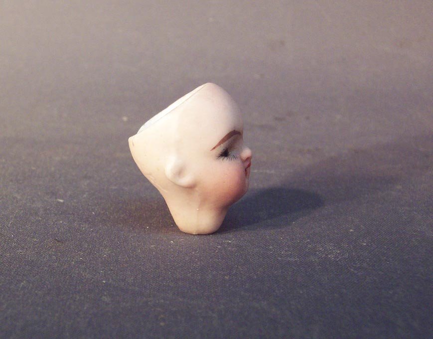 Porzellankopf, Puppenkopf, H. ca 3,5 cm. Schlafaugen, braune Augen.