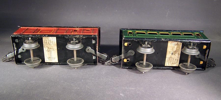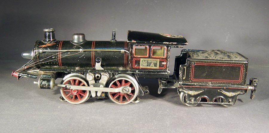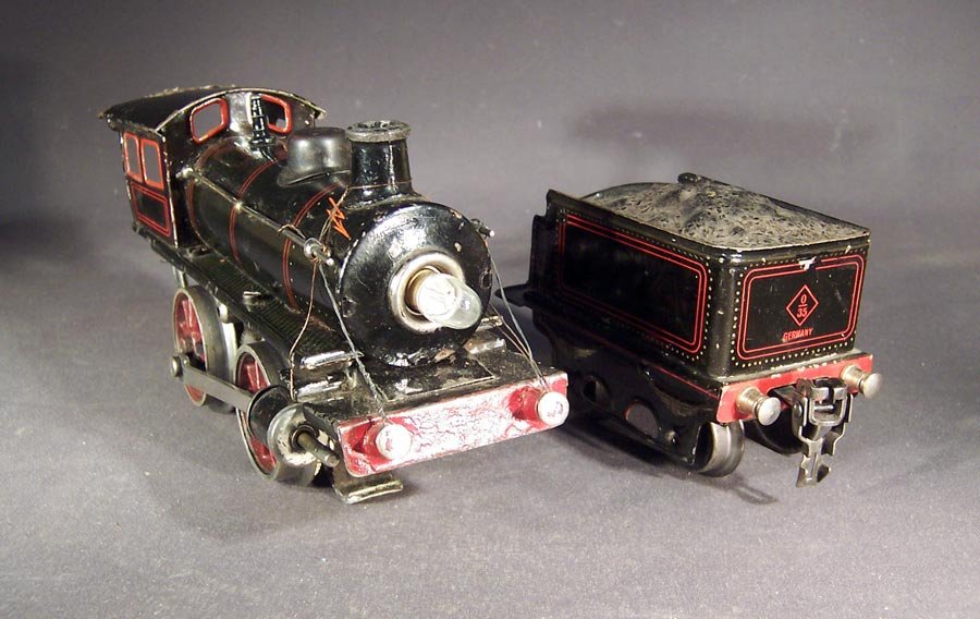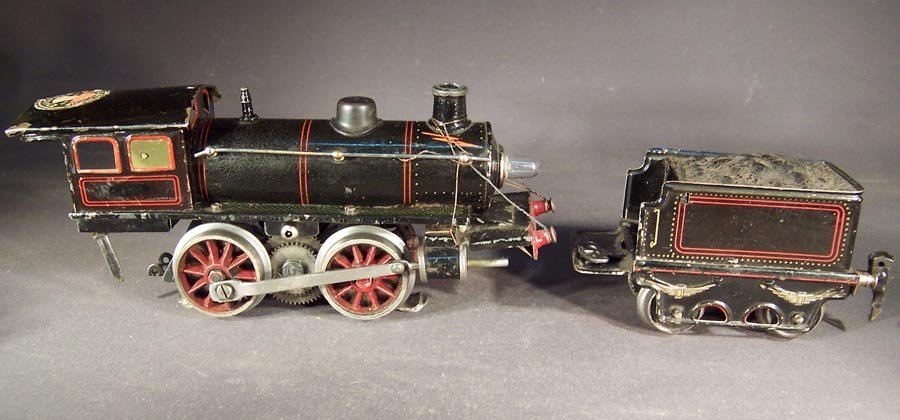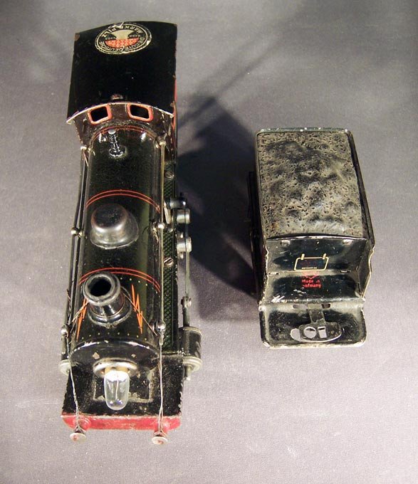 Märklin, Dampflok mit Tender und 2 Wagons Spur 0, elektrisch. 1 Wagen def. als Zugabe.