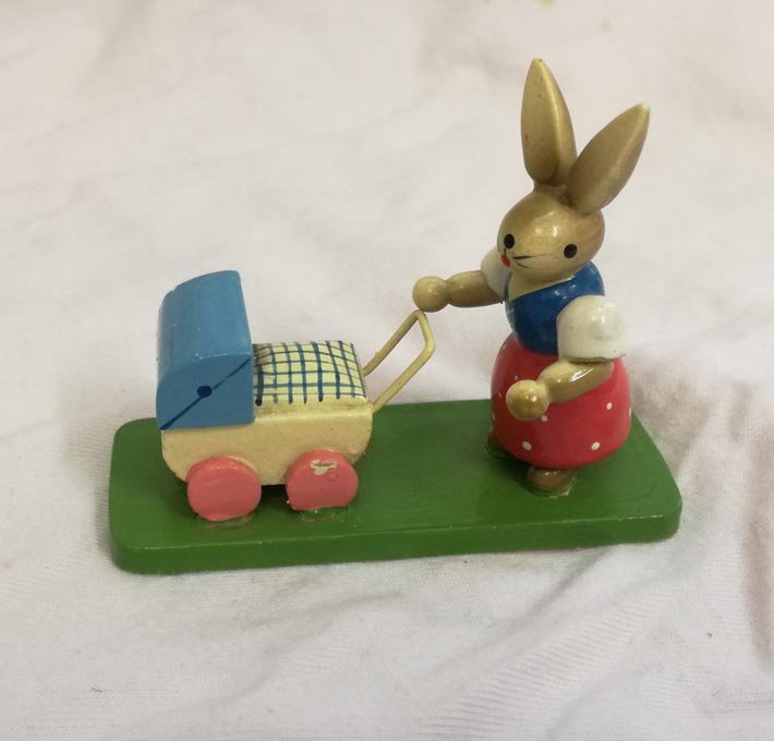 Häsin mit Kinderwagen. Im Kinderwagen ein Vogelküken. ESCO